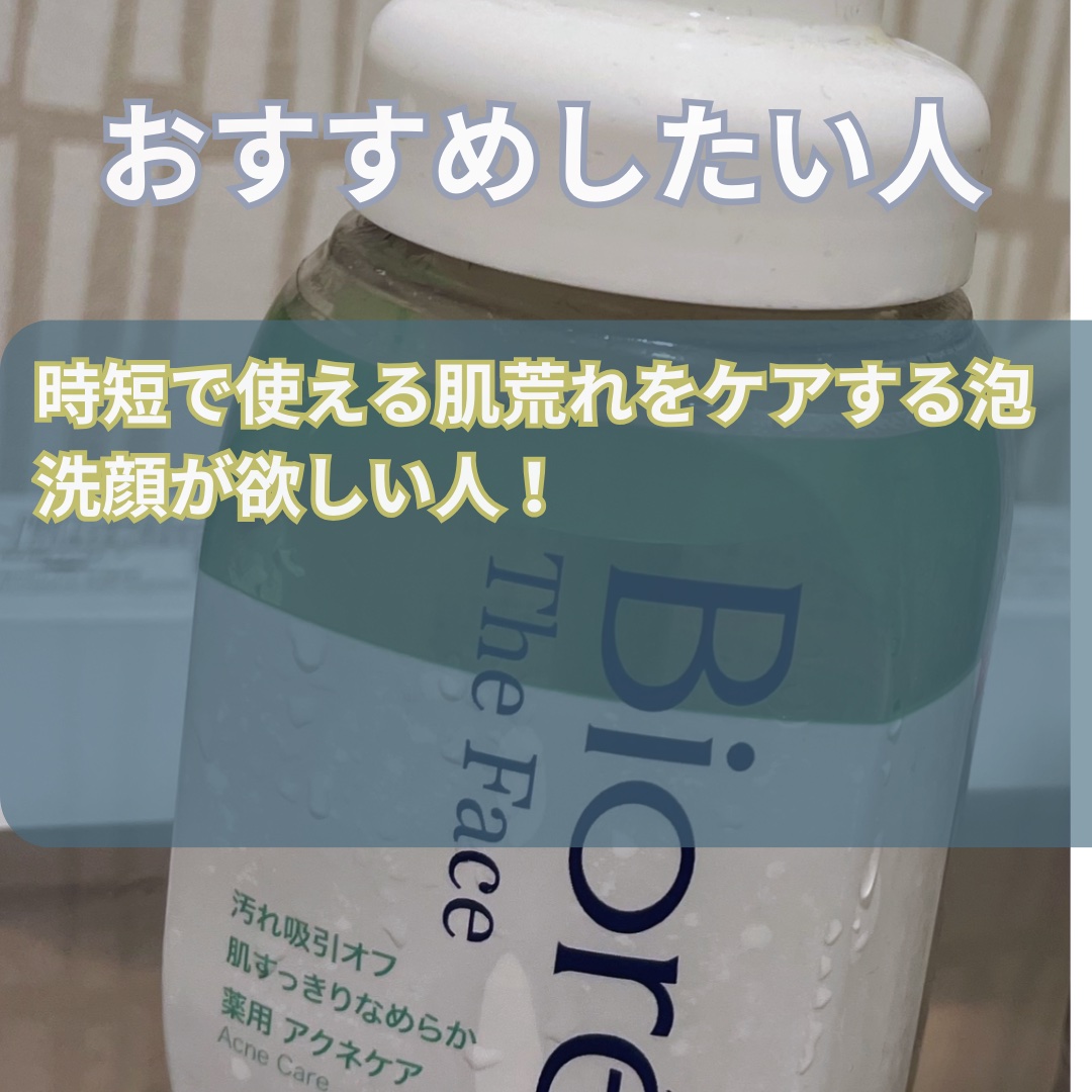 ビオレザフェイス泡洗顔料アクネケア【商品の特徴 使用感】泡がでるタイプの洗顔料顔を濡らしたらすぐにポンプを押してすぐ使えるつっぱりもなく使用感は良き【良いところ】時間がない時に洗顔を泡立てなくてよい泡がしっかりしてて、ふわふわ匂いが良かったヾ...