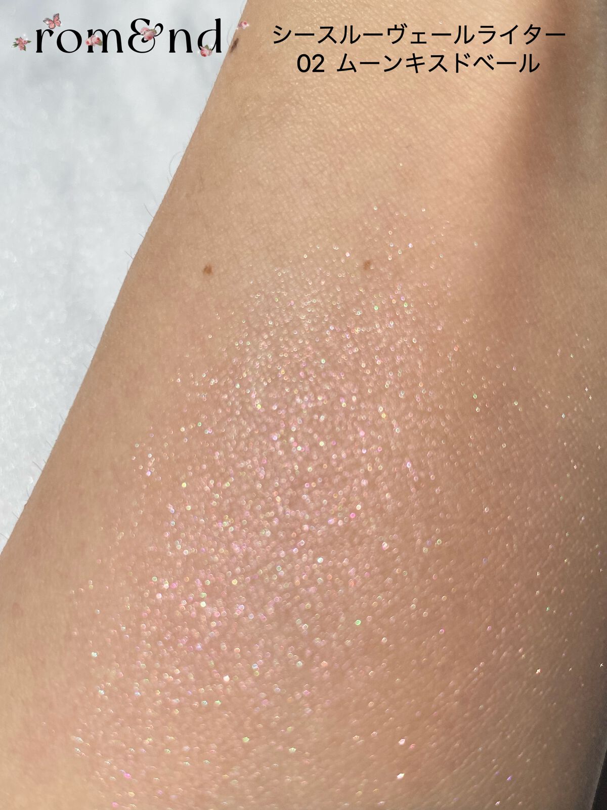 ロムアンドのハイライト完全に見逃してたんだけどこれキラッキラで可愛すぎた...♡⚜️rom&ndシースルーヴェールライター02ムーンキスドベールサラッとした粉質でテカリじゃなく綺麗なツヤっと肌に見せてくれるの本当に好き...結構大きめでたっぷ...
