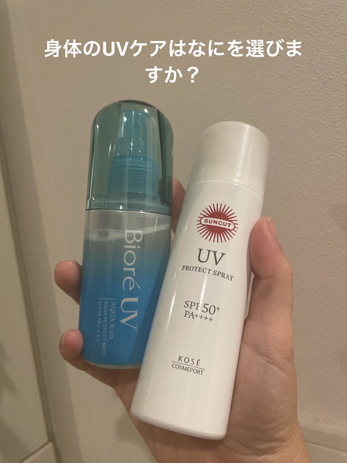 ビオレUVアクアリッチアクアプロテクトミストミストタイプの日焼け止め☀️髪にも使えるし、首や膝裏など塗りにくいところにも使いやすいです♪外出先での塗り直しにも便利!ガスタイプのスプレー缶だと、夏場に暑い中持ち歩くのも怖いし、公共のお手洗いで使...