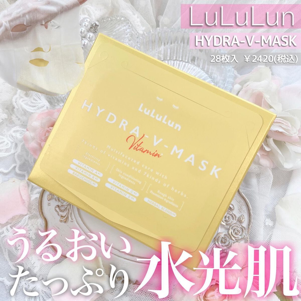 - ルルルンからビタミンたっぷりの化粧水フェイスマスクが新登場。 7種類のビタミン※1と7種類のハーブ※1で肌全体を素早くケア&集中肌メンテナンス。 新開発のフェイスラインに密着するシートで肌を引き締めながら肌のすみずみ※2までうるおいで満たし、毛穴の目立たないうるおいたっぷりの“水光肌”へ。 (※1 全て保湿成分として ※2 角質層まで)