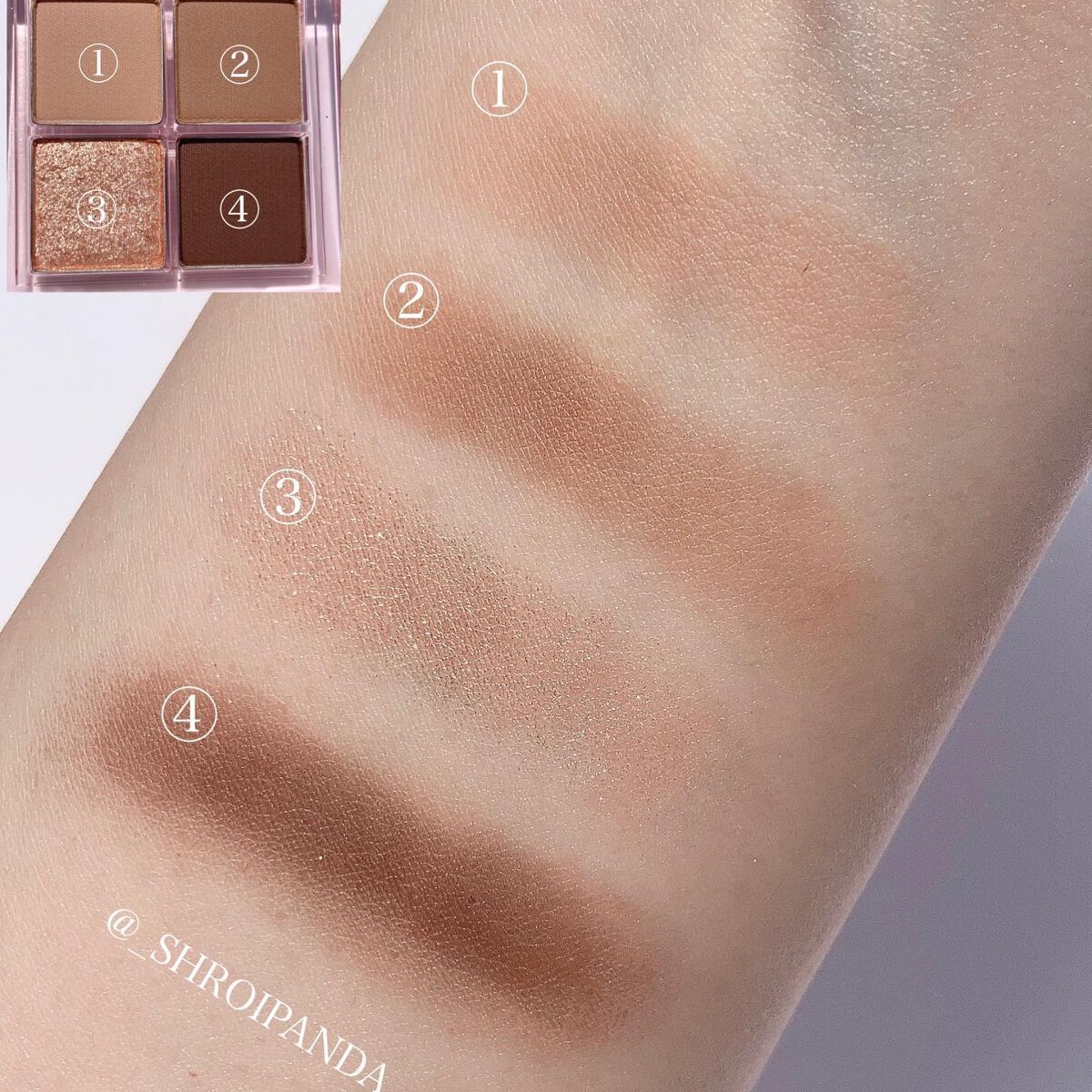 柔らかくて密着力の高いテクスチャーでマット3色ラメ1色のアイシャドウきなっています🥰 ソフトブラウンは大人っぽいシックなブラウン系の印象を演出できます🫶 明るさが欲しい方はアップルシナモンの方が良いかも🤔 甘めが好きな方はローズフォグが◎