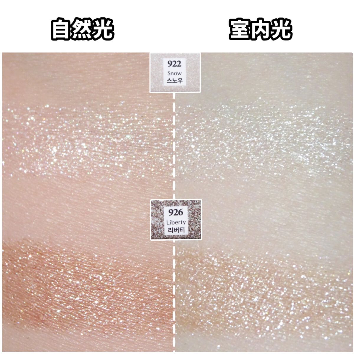 - こだわり抜いた感覚的な色彩の領域、そこで採取した多彩なモノシェード。 積み重ねるほどに深まるマットシャドウから、 清爽にきらめくグリッターまで。 ■ マット(901-920)l 柔らかく広がるふんわりとした塗り心地 柔らかな粒子のパウダーで、 色を重ねると水彩画のようにブレンディングされ、 感覚的な陰影を完成させます。 ■ グリッター(921-926)l 透明なガラスが輝くように反射するグリッター 高い反射率のスーパートゥインクルフォーミュラは、 小さい光でも豊かに輝きます。 動きに応じて光が当たる瞬間、 涼しくはじける水面のように輝きます。