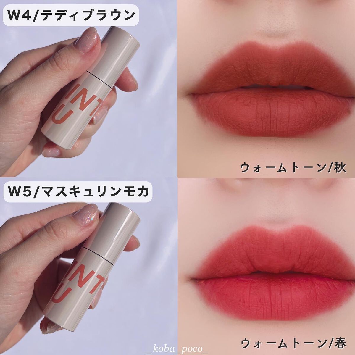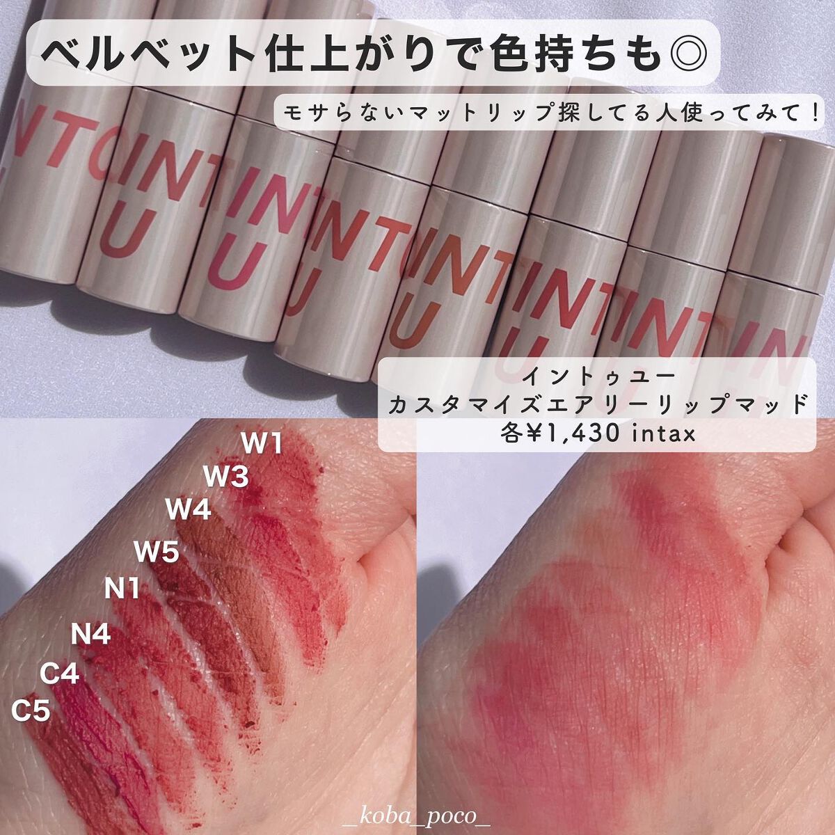 - INTO Uのスター商品でもある「泥リップ」を更に進化させ、より軽やかで、 より空気感のあるぼかしメイクを演出できるエアリーマッドリップを開発。 付け心地は軽やかでありながら、通常の泥リップよりもしっとり・ふんわり感が強く、「荒れにくい・乾燥しにくい」だけでなく、色持ちしつつ、もちもちなぼかしリップを綺麗に演出。 C(クールトーン)、N(ニュートラルトーン)、W(ウォームトーン)の3タイプにカラー分けしており、あなたにピッタリなカラーがすぐに見つかる。 奇麗なレイヤリングを叶え、好みに合わせたオリジナリティ溢れるカスタマイズカラーを進化した”エア泥リップ”でお楽しみください。