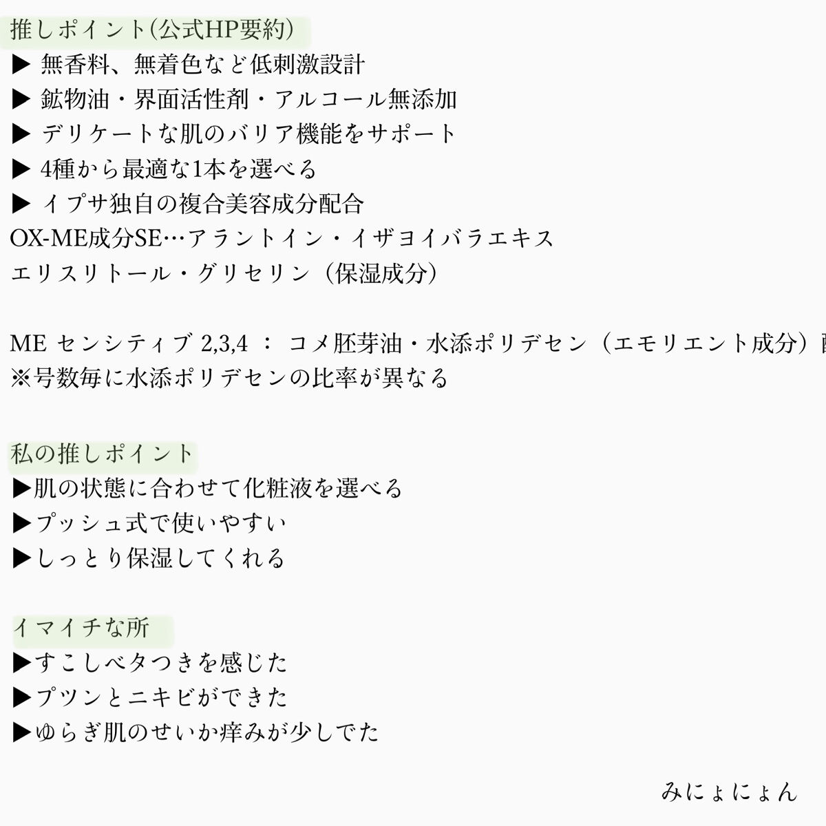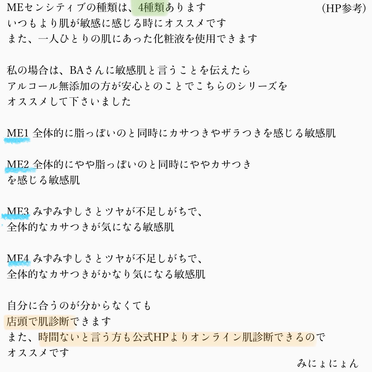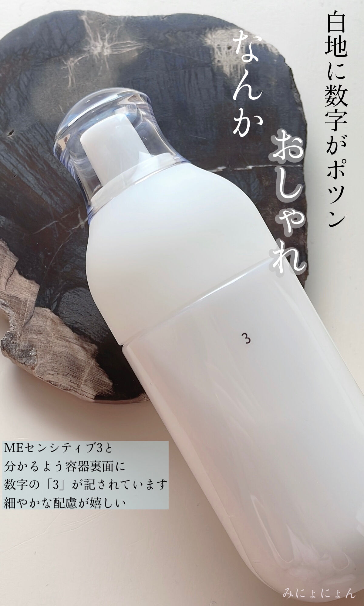- MEは一人ひとりの肌に合わせて、肌本来の美しさを引き出す化粧液。 美しい肌と酸素の関係に着目。一人ひとりの美しさに命を吹き込みます。 独自成分「OX-ME成分SE」*配合で、デリケートであれやすい肌のバリア機能をうるおいでサポートし、ぷるんと弾むようにすこやかな透明感あふれる肌へと導きます。 ノンコメドジェニックテスト、アレルギーテスト済み ※全てのかたにニキビができない、アレルギーが起きないというわけではありません。 ME センシティブ 3は、みずみずしさとツヤが不足しがちで、全体的なカサつきが気になる敏感肌におすすめ。 ○無香料・無着色、鉱物油、界面活性剤、アルコール、パラベンすべて無添加 ○敏感肌の方によるパッチテスト済み(全てのかたにしげきがないわけではありません) ○コメ胚芽油・水添ポリデセン(エモリエント成分)配合 ○センシティブのレフィルはございません。 * OX-ME成分SE(アラントイン・イザヨイバラ果実エキス・エリスリトール・グリセリン)(保湿成分)配合