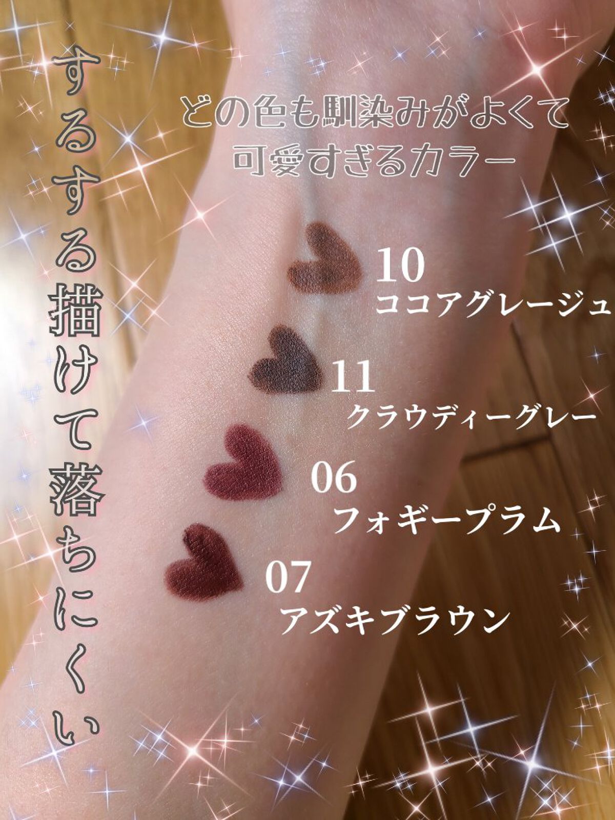 - <01 ディープブラック> メチルトリメチコン、トリメチルシロキシケイ酸、(アクリレーツ/アクリル酸ステアリル/メタクリル酸ジメチコン)コポリマー、ポリエチレン、カルナウバロウ、キャンデリラロウ、ジメチコン、水添レシチン、シリカ、メタクリル酸メチルクロスポリマー、トコフェロール、スクワラン、ホホバ種子油、マカデミア種子油、ヒアルロン酸Na、メチコン、(+/-)水酸化Al、酸化鉄、マイカ、酸化チタン <02 ミディアムブラウン> メチルトリメチコン、トリメチルシロキシケイ酸、(アクリレーツ/アクリル酸ステアリル/メタクリル酸ジメチコン)コポリマー、ポリエチレン、カルナウバロウ、キャンデリラロウ、ジメチコン、水添レシチン、シリカ、メタクリル酸メチルクロスポリマー、トコフェロール、スクワラン、ホホバ種子油、マカデミア種子油、ヒアルロン酸Na、メチコン、(+/-)水酸化Al、酸化鉄、マイカ、酸化チタン <03 ダークブラウン> メチルトリメチコン、トリメチルシロキシケイ酸、(アクリレーツ/アクリル酸ステアリル/メタクリル酸ジメチコン)コポリマー、ポリエチレン、カルナウバロウ、スクワラン、ジメチコン、水添レシチン、シリカ、トコフェロール、メタクリル酸メチルクロスポリマー、キャンデリラロウ、ホホバ種子油、マカデミア種子油、ヒアルロン酸Na、メチコン、水酸化Al、酸化鉄、酸化チタン、マイカ <04 ガーネットバーガンディ> メチルトリメチコン、トリメチルシロキシケイ酸、(アクリレーツ/アクリル酸ステアリル/メタクリル酸ジメチコン)コポリマー、ポリエチレン、カルナウバロウ、ジメチコン、キャンデリラロウ、水添レシチン、シリカ、トコフェロール、メタクリル酸メチルクロスポリマー、スクワラン、ホホバ種子油、マカデミア種子油、ヒアルロン酸Na、メチコン、水酸化Al、酸化鉄、グンジョウ、酸化チタン、マイカ <06 フォギープラム> メチルトリメチコン、トリメチルシロキシケイ酸、(アクリレーツ/アクリル酸ステアリル/メタクリル酸ジメチコン)コポリマー、ポリエチレン、カルナウバロウ、ジメチコン、キャンデリラロウ、水酸化Al、水添レシチン、シリカ、トコフェロール、メタクリル酸メチルクロスポリマー、スクワラン、ホホバ種子油、マカデミア種子油、ヒアルロン酸Na、メチコン、酸化鉄、グンジョウ、酸化チタン、マイカ <07 アズキブラウン> メチルトリメチコン、トリメチルシロキシケイ酸、(アクリレーツ/アクリル酸ステアリル/メタクリル酸ジメチコン)コポリマー、ポリエチレン、カルナウバロウ、キャンデリラロウ、ジメチコン、水添レシチン、シリカ、トコフェロール、メタクリル酸メチルクロスポリマー、スクワラン、ホホバ種子油、マカデミア種子油、水酸化Al、ハイドロゲンジメチコン、ヒアルロン酸Na、メチコン、酸化鉄、グンジョウ、マイカ、酸化チタン <09 ダージリンピンク> メチルトリメチコン、トリメチルシロキシケイ酸、(アクリレーツ/アクリル酸ステアリル/メタクリル酸ジメチコン)コポリマー、合成ワックス、カルナウバロウ、キャンデリラロウ、ジメチコン、水酸化Al、ハイドロゲンジメチコン、水添レシチン、シリカ、トコフェロール、メタクリル酸メチルクロスポリマー、スクワラン、ホホバ種子油、マカデミア種子油、ヒアルロン酸Na、メチコン、酸化鉄、酸化チタン、マイカ、グンジョウ <11 クラウディーグレー> メチルトリメチコン、トリメチルシロキシケイ酸、(アクリレーツ/アクリル酸ステアリル/メタクリル酸ジメチコン)コポリマー、合成ワックス、カルナウバロウ、ジメチコン、キャンデリラロウ、水酸化Al、水添レシチン、シリカ、トコフェロール、メタクリル酸メチルクロスポリマー、ハイドロゲンジメチコン、スクワラン、ホホバ種子油、マカデミア種子油、ヒアルロン酸Na、メチコン、酸化鉄、酸化チタン、マイカ <15 カプチーノピンク> メチルトリメチコン、トリメチルシロキシケイ酸、(アクリレーツ/アクリル酸ステアリル/メタクリル酸ジメチコン)コポリマー、合成ワックス、カルナウバロウ、ジメチコン、キャンデリラロウ、水酸化Al、水添レシチン、シリカ、トコフェロール、メタクリル酸メチルクロスポリマー、スクワラン、ホホバ種子油、マカデミア種子油、ヒアルロン酸Na、メチコン、酸化チタン、酸化鉄、マイカ <05 ビターキャラメル> メチルトリメチコン、トリメチルシロキシケイ酸、(アクリレーツ/アクリル酸ステアリル/メタクリル酸ジメチコン)コポリマー、ポリエチレン、カルナウバロウ、ジメチコン、キャンデリラロウ、水添レシチン、シリカ、トコフェロール、メタクリル酸メチルクロスポリマー、スクワラン、ホホバ種子油、マカデミア種子油、ヒアルロン酸Na、メチコン、水酸化Al、酸化鉄、マイカ、酸化チタン <08 マッチャカーキ> メチルトリメチコン、トリメチルシロキシケイ酸、(アクリレーツ/アクリル酸ステアリル/メタクリル酸ジメチコン)コポリマー、合成ワックス、