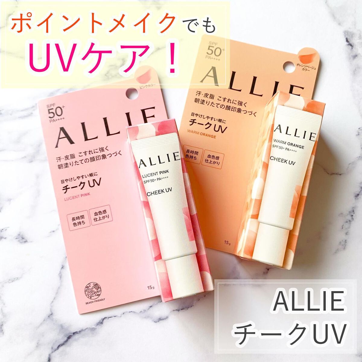 - ◆紫外線を浴びやすい、頬に使えるチークUV/鼻・頬に使える追いツヤUV ◆メイクの上から塗り直しとしても使える。 ◆汗・皮脂 マスクやタオルなどのこすれにも強く落ちにくい。 ◆「カラーUVヴェール技術」で、ベースメイクと混ざりにくく均一に密着。 SPF50+と感触の良さはそのままに素肌を活かした自然な色づきを両立! ◆8時間色持ち データ取得済み ※アリィー調べ。効果には個人差があります。 <基本情報> ・強力UV カット(SPF50+・PA++++) ・フリクションプルーフ:タオルやマスク等のこすれにも強く、落ちにくい ・スーパーウォータープルーフ:汗・水に抜群※²に強い機能 ※² アリィー商品内において LUCENT PINK(チーク 01) 自然に色づき血色感仕上がりの‟透け感ピンク” パッケージもピンクで、ポーチの中も華やぐメイクアイテムです WARM ORANGE(チーク 02) ヘルシーな血色感仕上げの‟じんわりオレンジ” じんわ~りと血色感を与えてくれるから、素肌を活かした自然な仕上がりに TRANSLUCENT(ラスター) ツヤ感を演出する‟シマーカラー” 鼻や頬にハイライトとして使うことで長時間ツヤが持続します