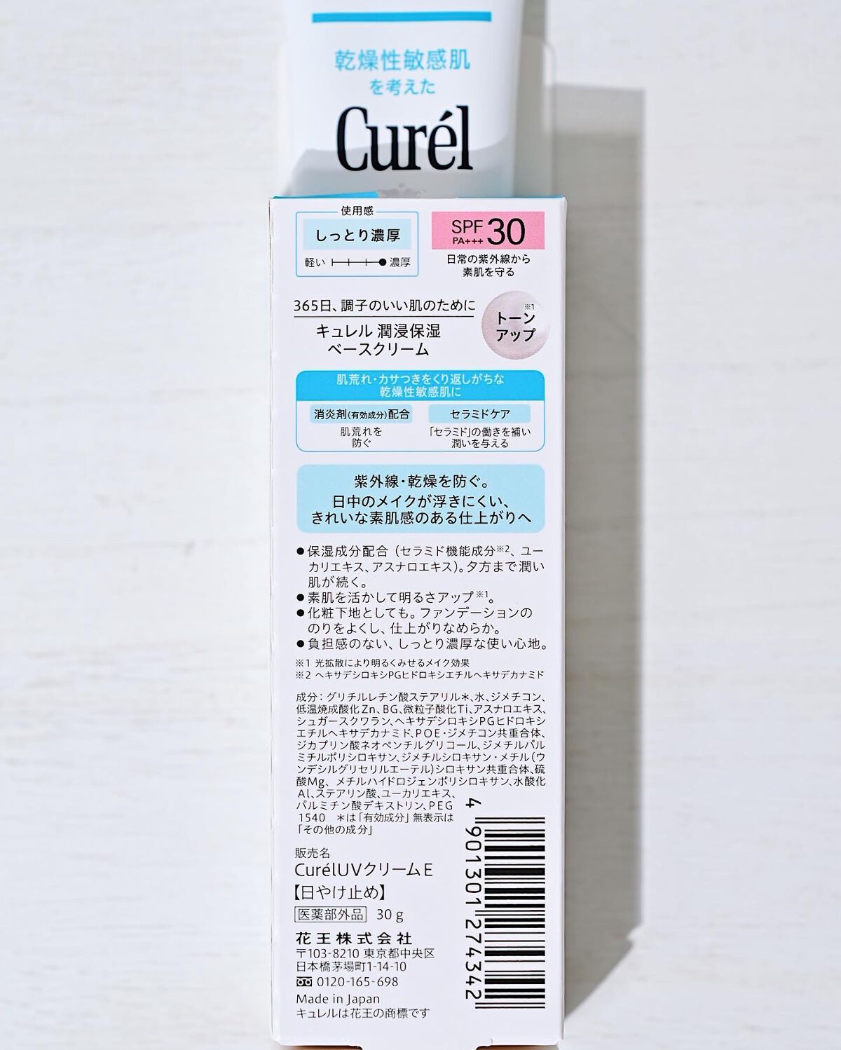 - 【敏感肌用】 紫外線・乾燥から肌を守る。消炎剤配合で肌荒れを防ぐ。セラミドケア*1できる肌きれい見せベース。 ●保湿成分(セラミド機能成分*2、ユーカリエキス、アスナロエキス)配合。長時間潤い続く。 ●素肌を活かしてトーンアップ(光拡散によるメイク効果) ●化粧下地としても ●負担感の無いしっとり濃厚な使い心地。 【医薬部外品】 *1セラミドの働きを補い潤いを与える *2ヘキサデシロキシPGヒドロキシエチルヘキサデカナミド 商品に関するお問い合わせ 受付時間9:00~17:00(土曜・日曜・祝日除く) *製品の誤飲・誤食など緊急の場合は、受付時間外でもお電話ください キュレル:0120-165-698
