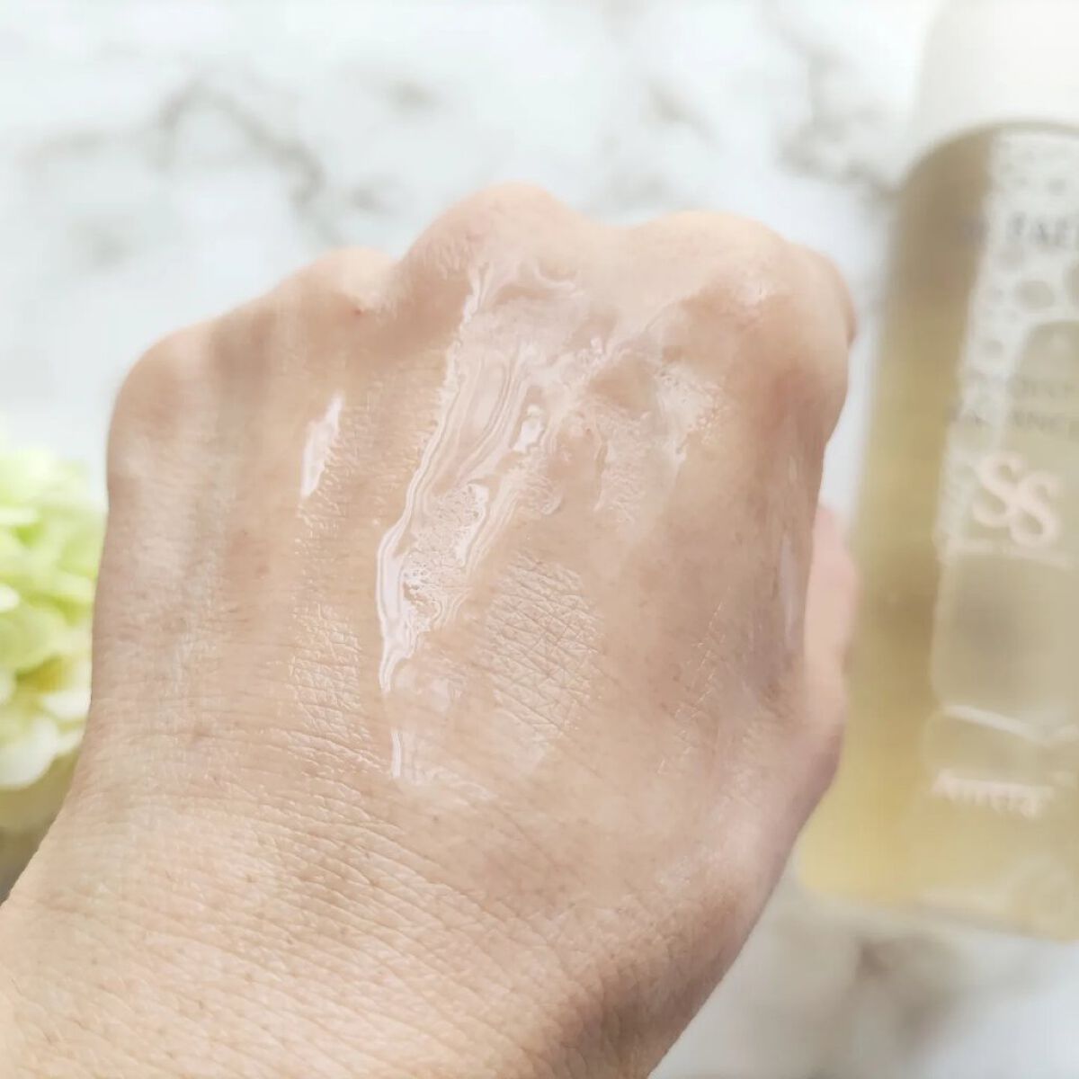 しっとりな使い心地がうれしい💛 高級感のあるガラスボトルがとっても素敵です! オイル層とローション層に分かれてるのでまずはよ~く振ってから使ってね。 オイルが入っているとは思えないようなサラッとしたテクスチャー✨ なじませると、みずみずしく しっとりとした使い心地です🤍 肌にほどよいツヤ感が出るので、ツヤ肌メイク好きの方にも向いている思う! 9つのフリー処方なのも、ゆらぎ肌にはうれしい処方だよね。
