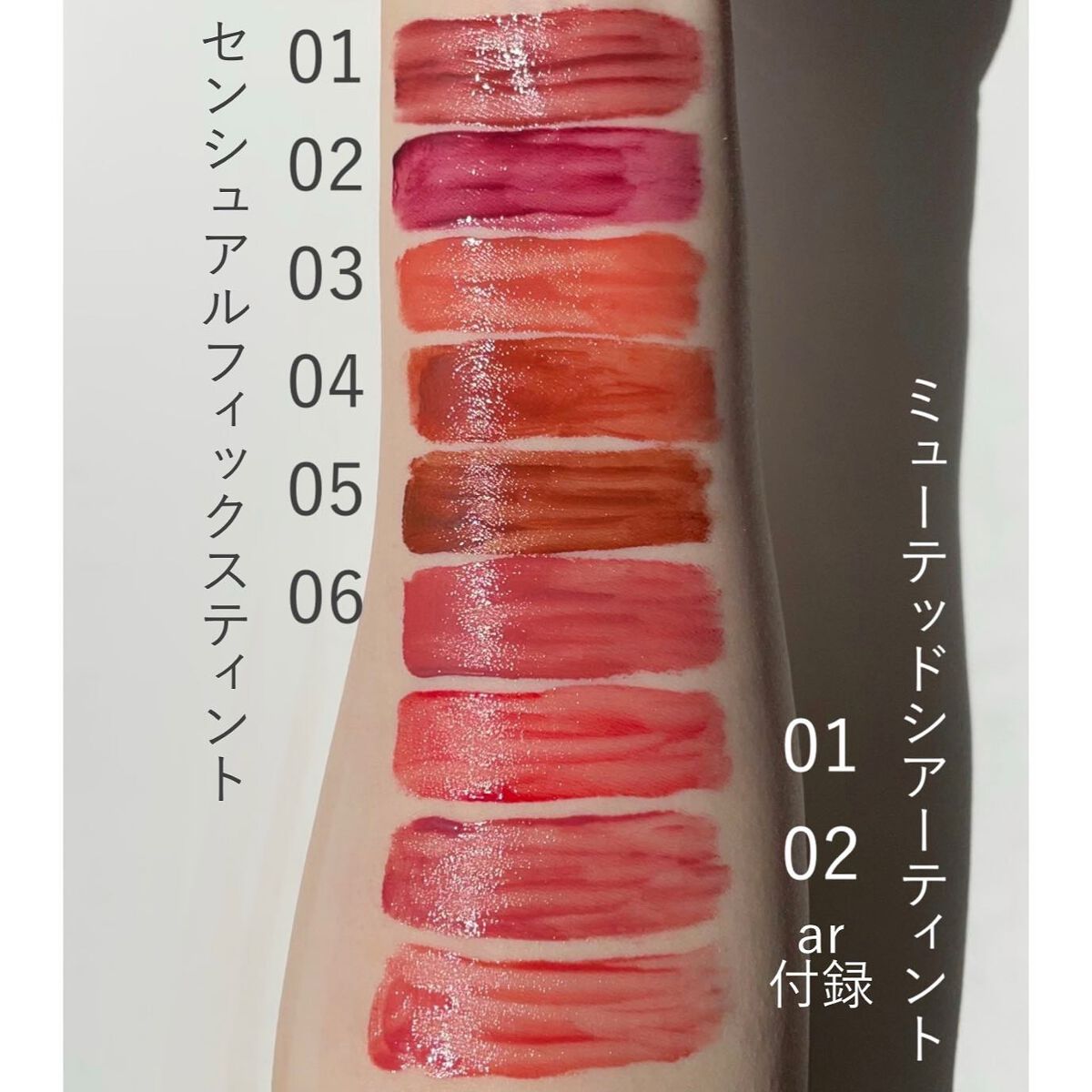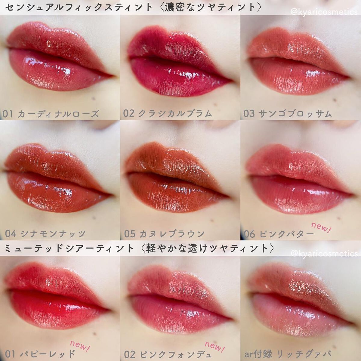 既存シリーズ→濃密なツヤティント 新シリーズ→軽やかでフレッシュなツヤティント 新作発売と同時に出荷停止していた センシュアルフィックスティント01〜05も 再販されています!
