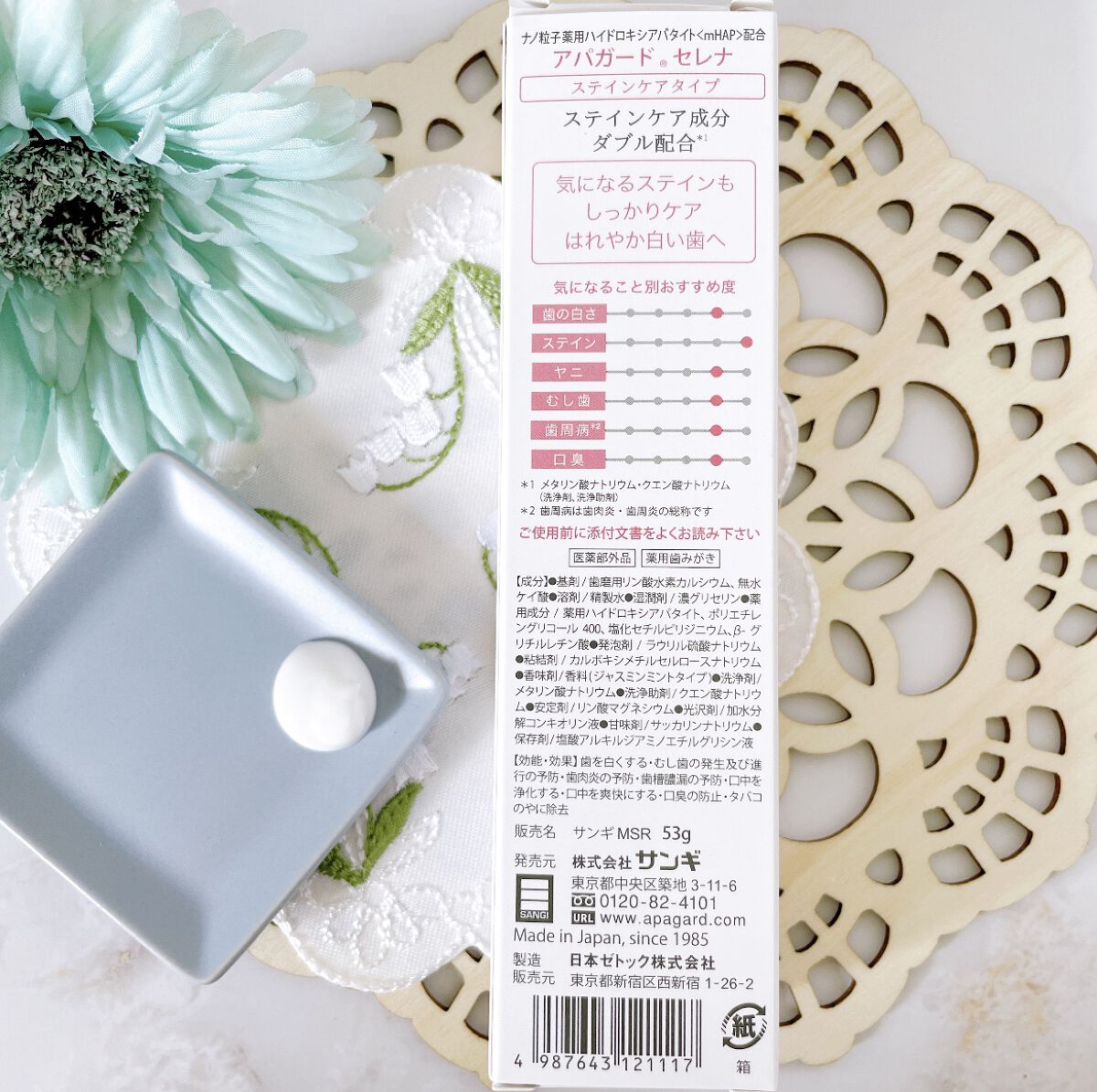 🩷アパガードセレナ53g[医薬部外品/薬用歯みがき販売名:サンギMSR]独自成分「薬用ハイドロキシアパタイト」がエナメル質を整え、むし歯の予防に役立つそうです。アパガードはエナメル質の健康を保つことで自然な白い歯に導くことを目指す美白歯みがき...