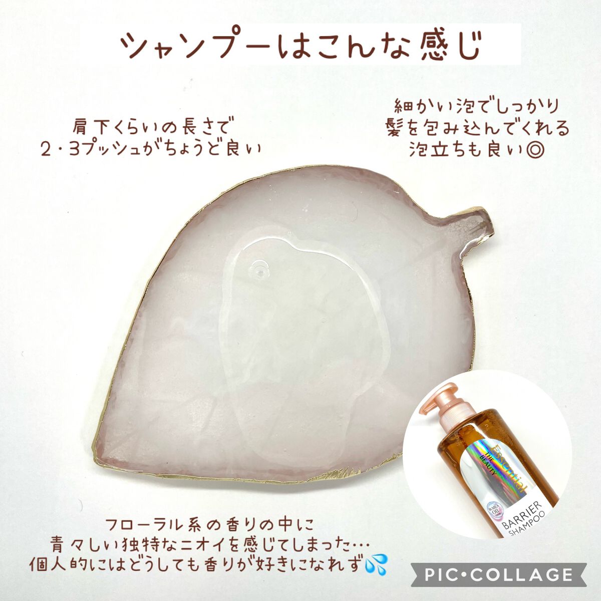 - うる髪続くバリアシャンプー・コンディショナー 雨の日、乾燥した日も しなやかにまとまる 【バリアシャンプー・コンディショナー共通】 ●浸透美髪バリア処方 ・髪内部のダメージ補修 ・ 髪本来のバリア機能*の働きを補う *髪の毛流れに変化を及ぼす湿度・摩擦等からバリアする機能 ●天然由来の美髪オイル 18-MEA OIL*配合(毛髪保護)*ラノリン脂肪酸 ●サルフェートフリー処方 ●合成着色料フリー ●加水分解コラーゲン・スクワラン・シアバター配合(保湿) ✿フローラルリュクスの香り 【バリアシャンプー】 ●3種のアミノ酸系洗浄成分使用 ●とろふわスフレ泡で素髪が持つ美髪成分*を守りながらやさしく洗う *タンパク質、脂質 ●ノンシリコーン処方 【バリアコンディショナー】 ●傷んだ髪を集中補修&コート ●湿度や摩擦等の外部刺激から髪を守る ●セラミドES*配合(補修)*ビスメトキシプロプルアミドイソドコサン