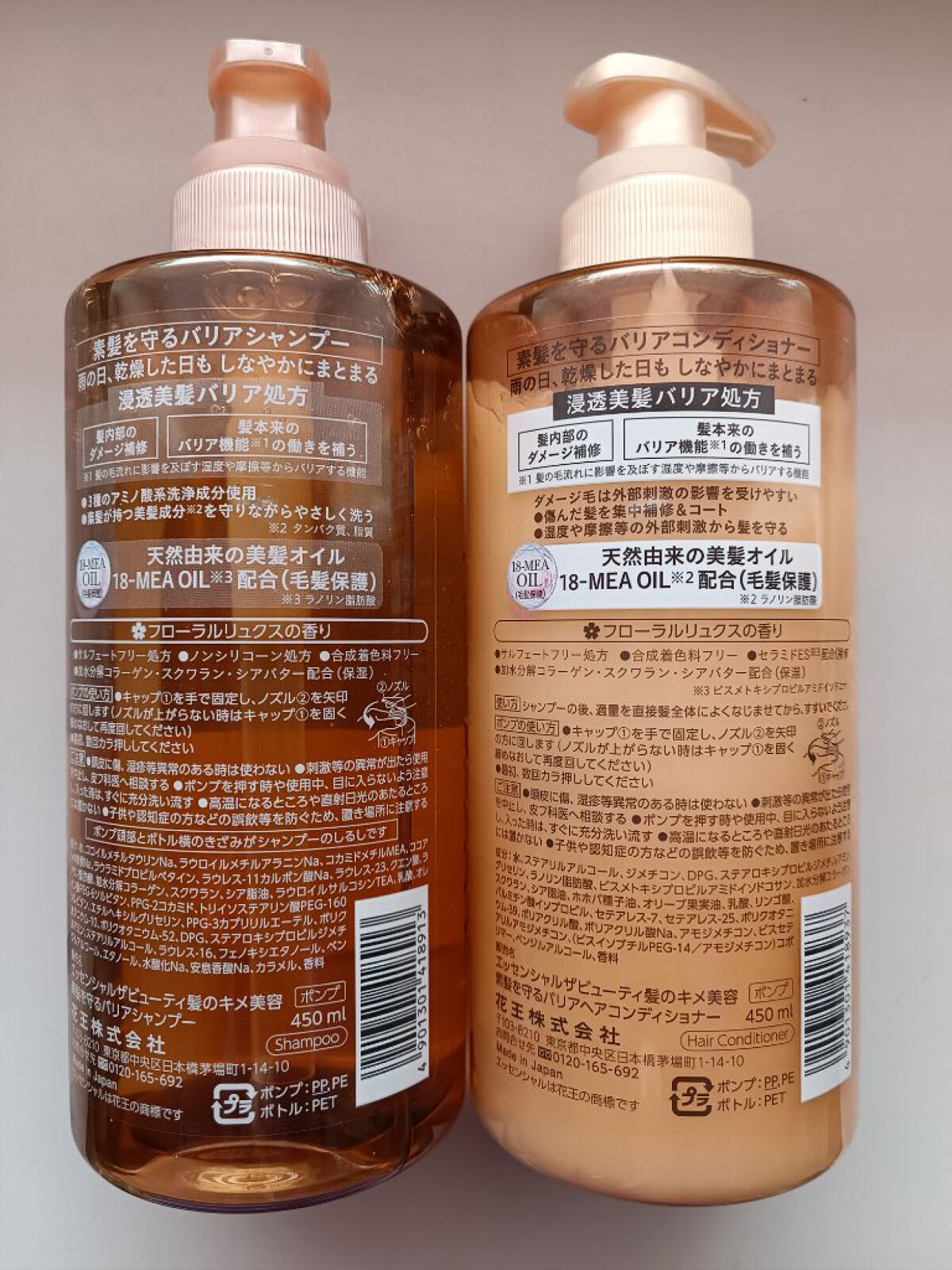 - うる髪続くバリアシャンプー・コンディショナー 雨の日、乾燥した日も しなやかにまとまる 【バリアシャンプー・コンディショナー共通】 ●浸透美髪バリア処方 ・髪内部のダメージ補修 ・ 髪本来のバリア機能*の働きを補う *髪の毛流れに変化を及ぼす湿度・摩擦等からバリアする機能 ●天然由来の美髪オイル 18-MEA OIL*配合(毛髪保護)*ラノリン脂肪酸 ●サルフェートフリー処方 ●合成着色料フリー ●加水分解コラーゲン・スクワラン・シアバター配合(保湿) ✿フローラルリュクスの香り 【バリアシャンプー】 ●3種のアミノ酸系洗浄成分使用 ●とろふわスフレ泡で素髪が持つ美髪成分*を守りながらやさしく洗う *タンパク質、脂質 ●ノンシリコーン処方 【バリアコンディショナー】 ●傷んだ髪を集中補修&コート ●湿度や摩擦等の外部刺激から髪を守る ●セラミドES*配合(補修)*ビスメトキシプロプルアミドイソドコサン