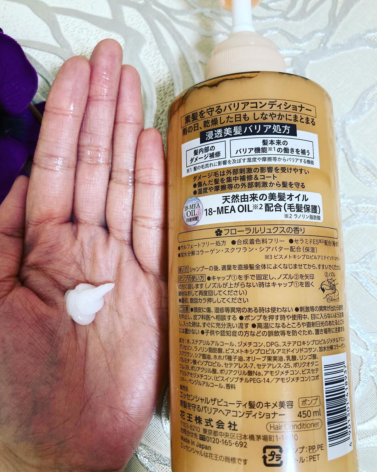 - うる髪続くバリアシャンプー・コンディショナー 雨の日、乾燥した日も しなやかにまとまる 【バリアシャンプー・コンディショナー共通】 ●浸透美髪バリア処方 ・髪内部のダメージ補修 ・ 髪本来のバリア機能*の働きを補う *髪の毛流れに変化を及ぼす湿度・摩擦等からバリアする機能 ●天然由来の美髪オイル 18-MEA OIL*配合(毛髪保護)*ラノリン脂肪酸 ●サルフェートフリー処方 ●合成着色料フリー ●加水分解コラーゲン・スクワラン・シアバター配合(保湿) ✿フローラルリュクスの香り 【バリアシャンプー】 ●3種のアミノ酸系洗浄成分使用 ●とろふわスフレ泡で素髪が持つ美髪成分*を守りながらやさしく洗う *タンパク質、脂質 ●ノンシリコーン処方 【バリアコンディショナー】 ●傷んだ髪を集中補修&コート ●湿度や摩擦等の外部刺激から髪を守る ●セラミドES*配合(補修)*ビスメトキシプロプルアミドイソドコサン