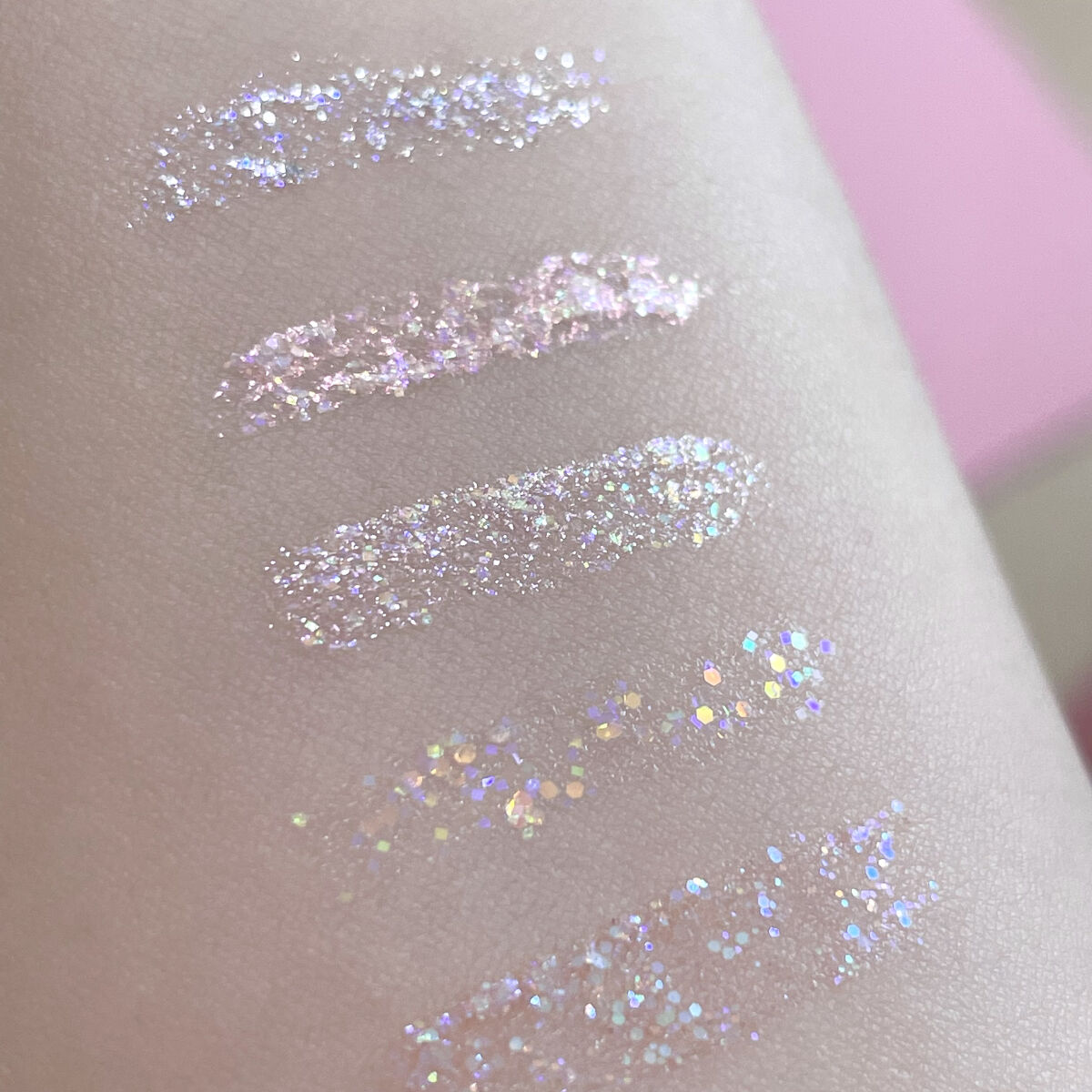 シピシピは見る角度によってピンクっぽく見えます。シルバーラメが目立ちます リリミュウはピンクベースでラメというよりペタッとしたキラキラ感でピンポイントで付けるのがおすすめです ウォンジョンヨの01は小さめのラメが多めでメイクを選ばず、1番使いやすいです◎ ウォンジョンヨの02とフォレンコスは魚の鱗のようなキラキラで、粒が大きめなので韓国アイドルのようになれます フォレンコスのタアフは少し珍しいオレンジラメが角度によってブルーに変わります🧡 リリミュウは筆がシリコンチップになっています どれも顔を動かすたびに色が違って見えるのがとても可愛いです🤍