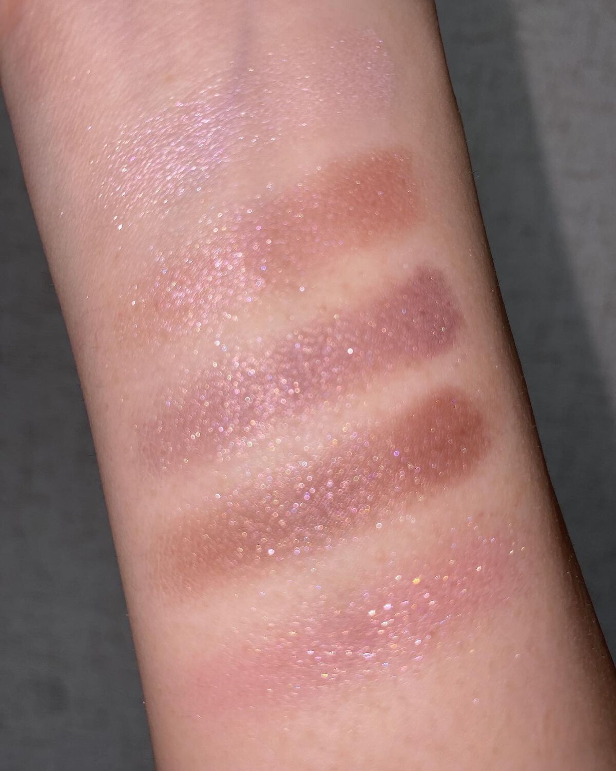 パウダーなのにみずみずしい♥ 全体的に濡れた様な艶が綺麗なアイシャドウで、屋内で見ても屋外で見ても最高にラメが綺麗。 左のカラーは白を多く混ぜたラベンダーカラーで、ベースカラーにぴったりな色。ラメがぱっと瞼を明るくしてくれる。 中央のカラーは、発色そのものは左のカラーと大差無いが、ラメの多さが違いこちらの方がよりぎっしり。多色ラメが宝石の様に散りばめられていて、ラメ好きにはたまらない。 右のカラーは深みの感じるパープルブラウン。締め色カラーだが私は二重幅ぐらいまでがっつりぬるのが目元に奥行きとかっこよさが出て好き。 どのカラーも自然に目を大きく見せてくれる。グラデーションもしやすく、また3色というのも捨て色が無いので非常に使いやすい。 粉はパサパサしてはいないが少しラメ飛びはするかもしれない。 ただ、こういった青みが強いかつ、普段使いしやすいアイシャドウパレットはなかなか無いのでありがたい。 きらめく艶が綺麗なので、別のカラーの購入の方も検討したい。