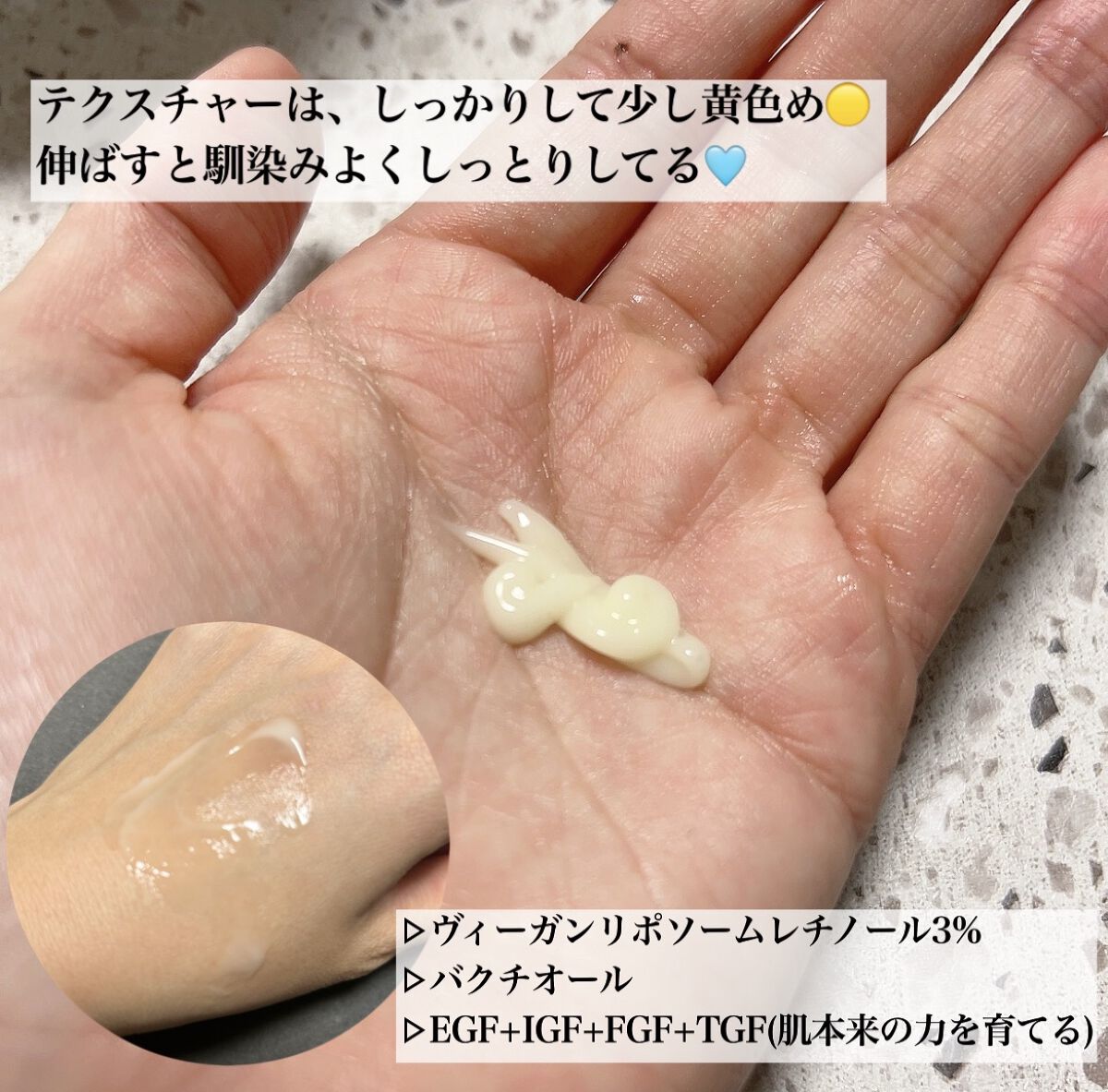 ヴィーガンレチノール使用! ・ブィーガンレチナールで肌リセット ・ブィーガンリポゾームレチナール3%、バクチオール、EGF+IGF+FGF+TGFの成分で刺激を与えず確実な効果をお届けます。 テクスチャーは伸びが良く肌馴染みも良く香りも特にせずわたしは気になりませんでした🤔 これを使ってるからなのかな??最近心なしか肌の調子がとても良い👏🏽✨✨