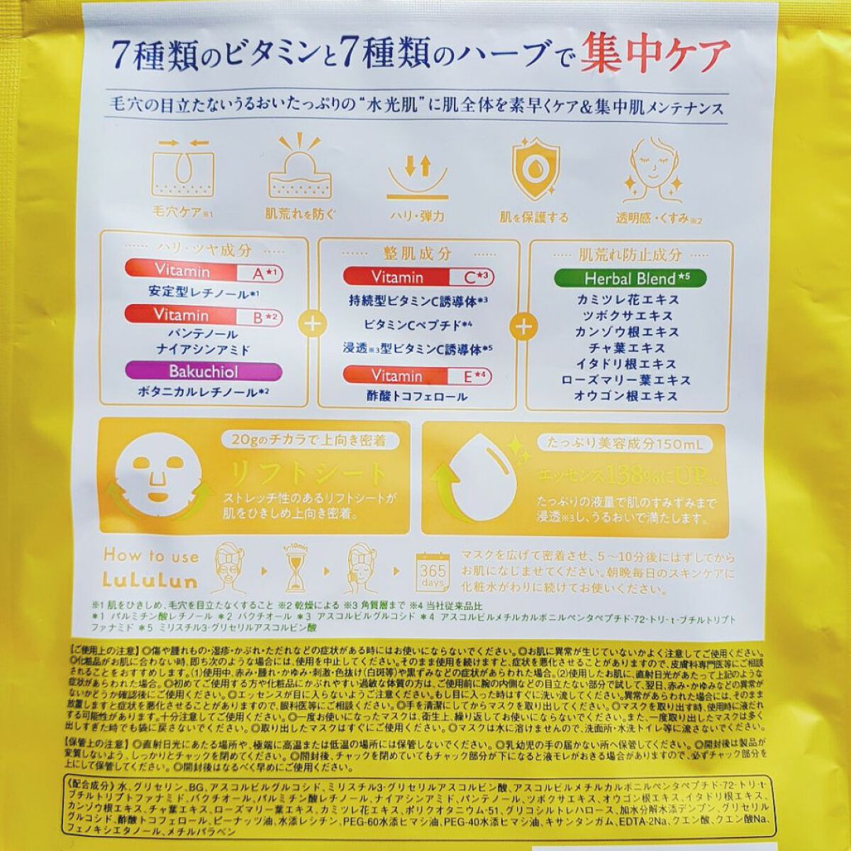 - ルルルンからビタミンたっぷりの化粧水フェイスマスクが新登場。 7種類のビタミン※1と7種類のハーブ※1で肌全体を素早くケア&集中肌メンテナンス。 新開発のフェイスラインに密着するシートで肌を引き締めながら肌のすみずみ※2までうるおいで満たし、毛穴の目立たないうるおいたっぷりの“水光肌”へ。 (※1 全て保湿成分として ※2 角質層まで)