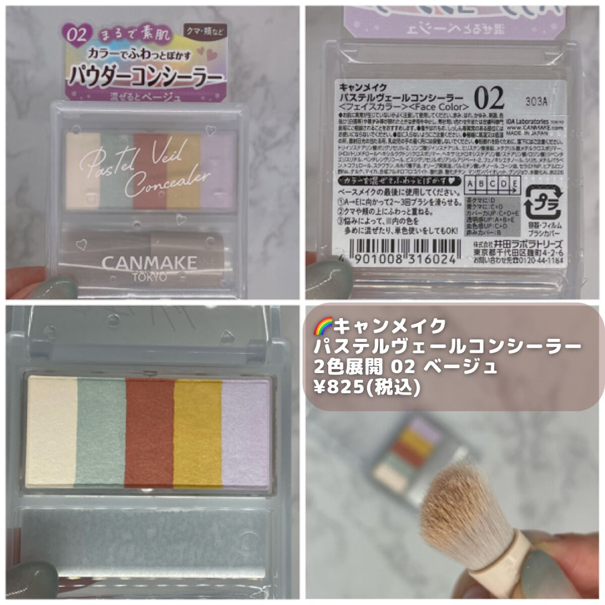 キャンメイク パステルヴェールコンシーラー02 ベージュめるで素肌クマ、頬パウダーコンシーラーカラーでふわっとぼかす混ぜるとベージュベースメイクの最後に使用します。左から順番に2〜3回ブラシを滑らせる。クマや頬の上にふわっと重ねる悩みによって...