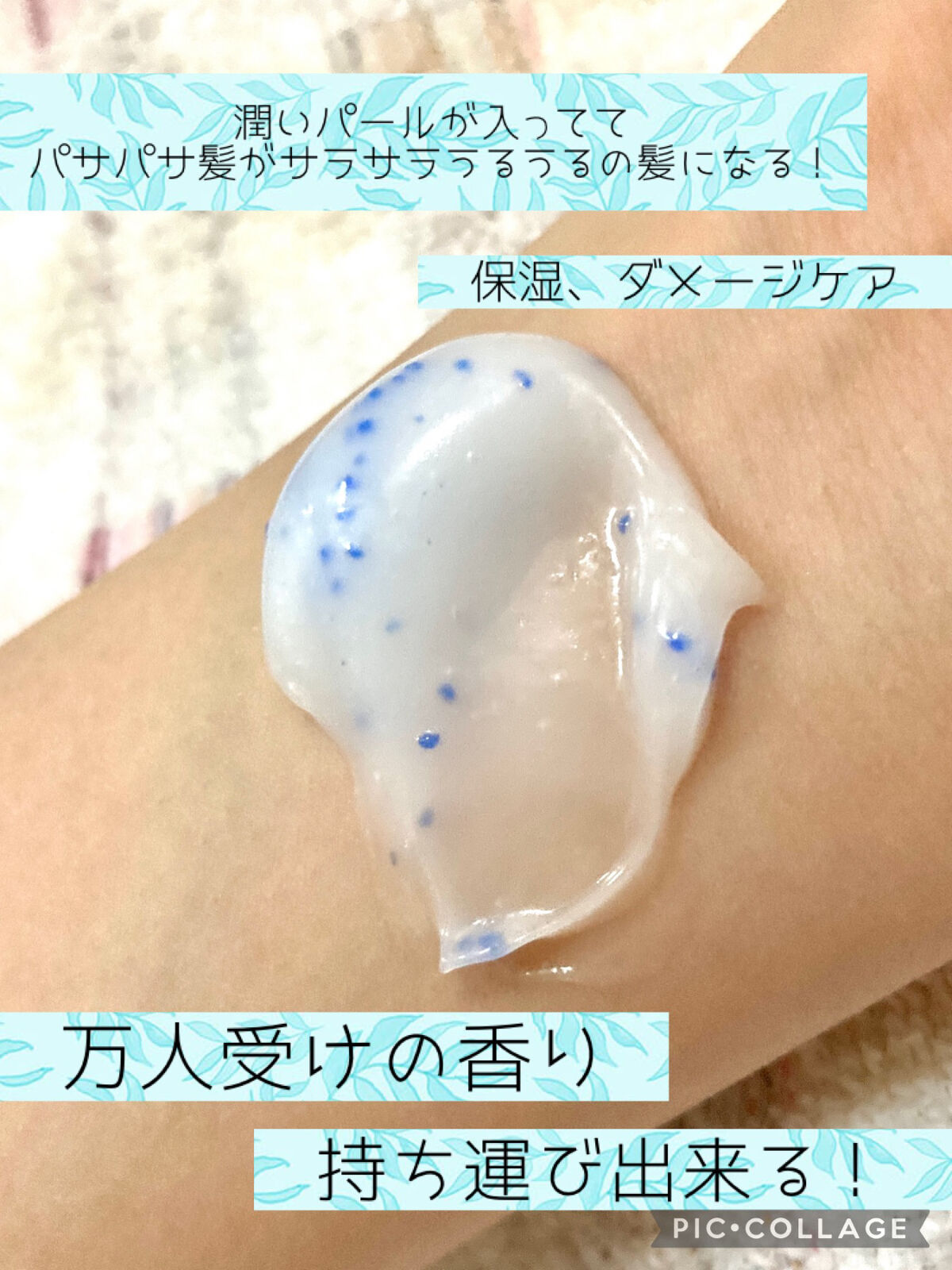 いい匂いがする! メルティ潤いパールが配合されていて髪の毛がしっとりしてまとまりがでる! 中身が沢山入っていて髪の毛の量が多い人でも満足できるくらい入ってる! 使い過ぎ注意かも! 毎日使うと髪の毛しっとりしすぎる人もいるかもしれないです!