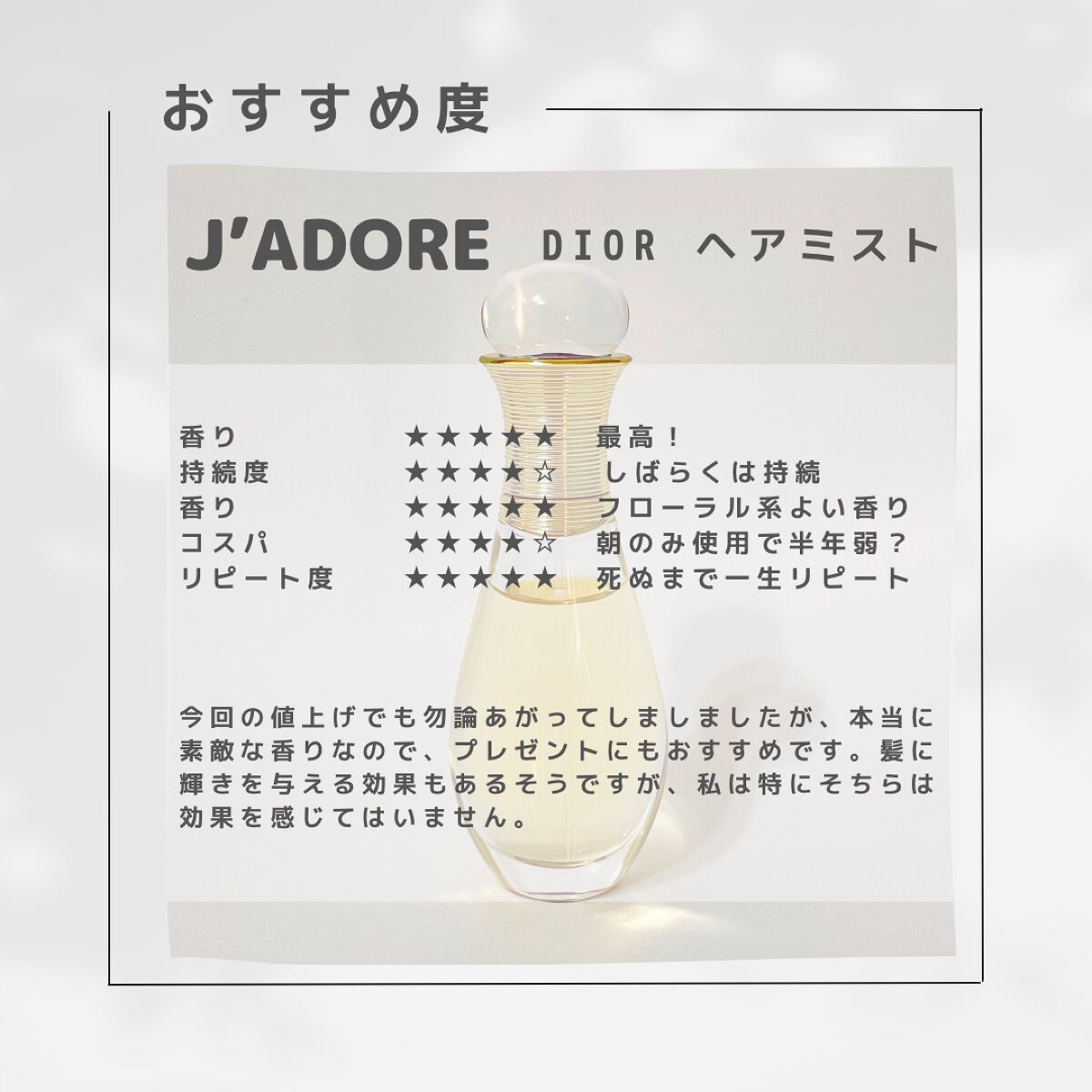 大好きな香りのヘアミスト。 10年以上使い続けて、これがないと落ち着かないくらい、自分の一部になってしまっています。 この香りはジャドールでしかない、そんな香りです!