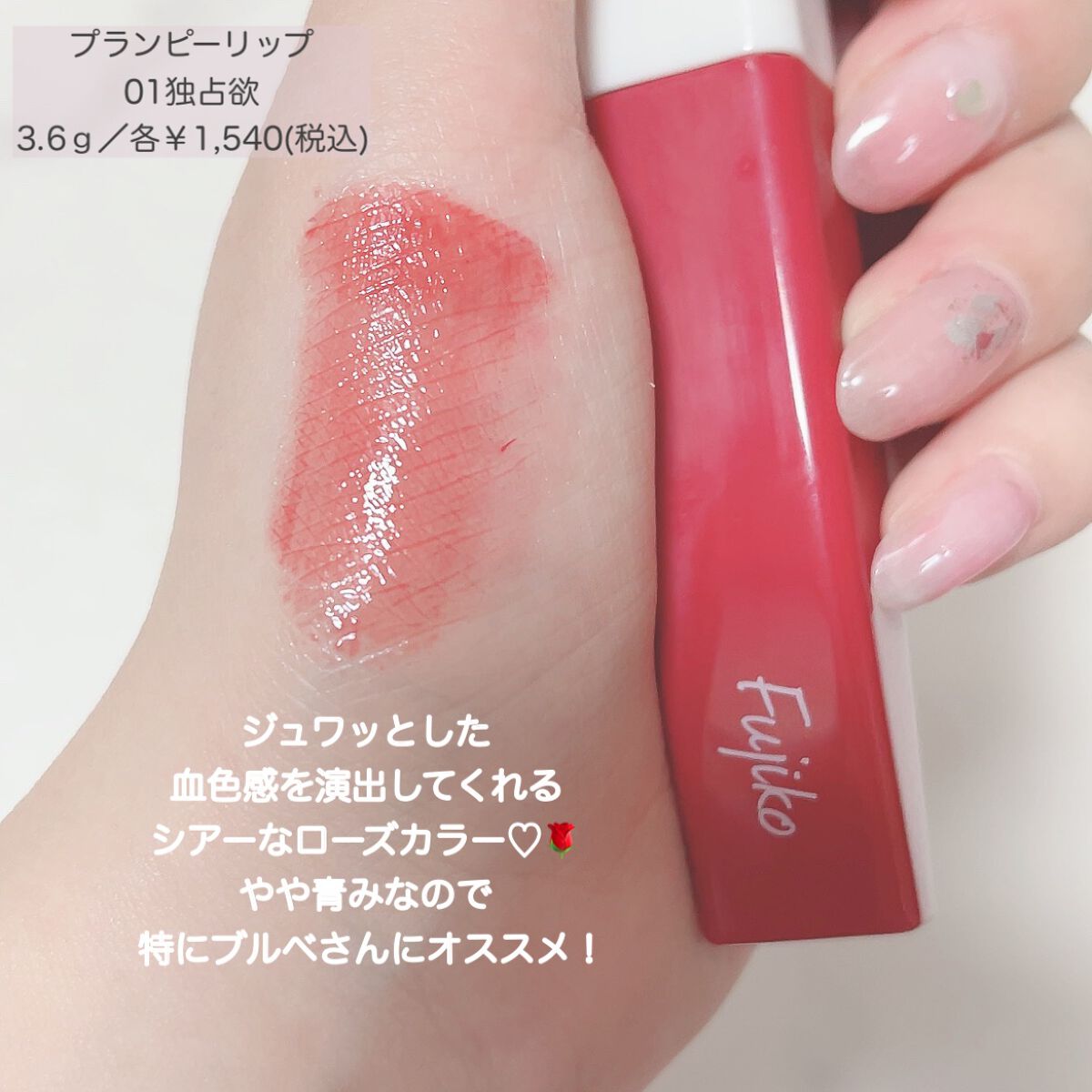 - フジコの新リップは、重ねるほどにパーンと膨んでみえるプランプティント*1。 ぷっくりと存在感のあるリップメイクで唇を主役に。 <プランプ成分(清涼成分)> "メントキシプロパンジオール”採用。 血色感、ボリューム感、クーリング感を演出します。 <オイルウォーターティント処方> 軽やかなオイルが唇に均一に伸び広がり、 FIXING。 時間が経ってもボリューム感と光沢感を演出。 しかもティントだから“落ちにくい”(*2)。 <5種の美容保湿成分配合> アルガンオイル・ツバキ種子油・アーモンド油 ティーツリー葉油・ハチミツエキス *1全てメイクアップ効果 *2効果・効能には個人差があります。