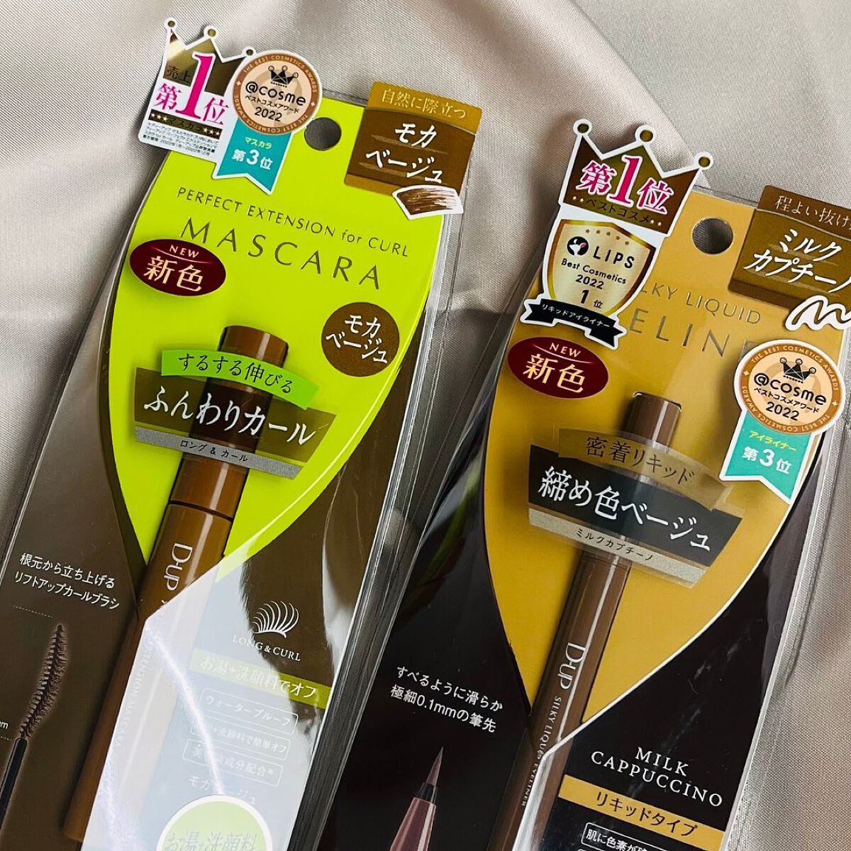 パーフェクトエクステンションマスカラ for カール マスカラ新色 『モカベージュ』 小さめブラシで小回り◎+カールブラシが目のカーブにフィットして塗りやすい🥰 シルキーリキッドアイライナー アイライナー新色 『ミルクカプチーノ』 目尻までかすれず滑らかに理想のラインが描けて、長時間キープ😘 王道ブラウンよりも、柔らかな存在感 やわらかい雰囲気を作りたいときはこれ😍