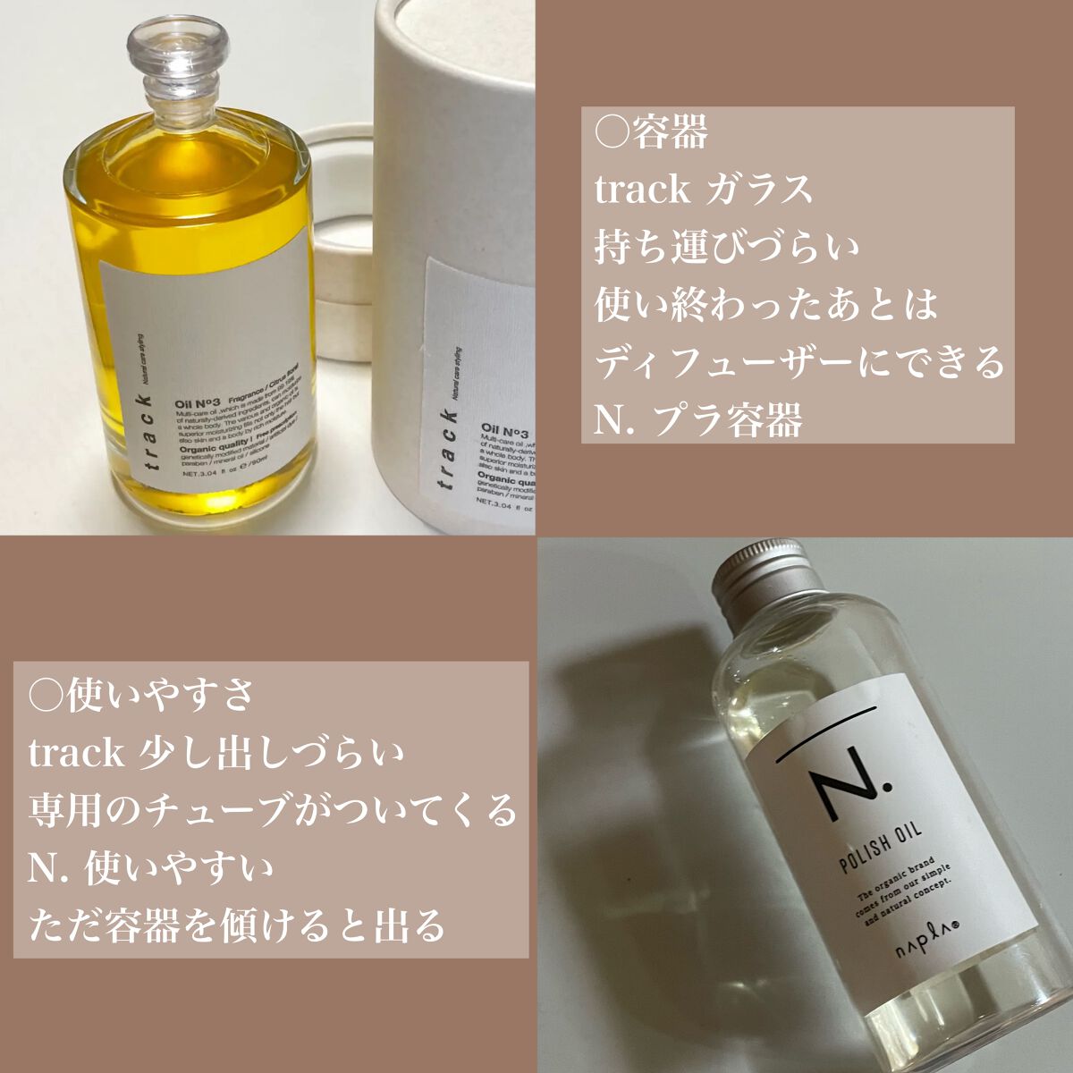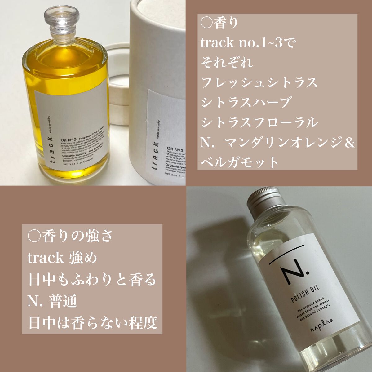 N. 重たい track やや重い N. 柑橘系 track No.によって匂いが異なります No.3は金木犀の香りです わたし的に好きなのはNです ポリッシュオイルをつけた方が形がつきやすい。持ちがいい。 trackはポリッシュオイルに比べて軽いんです 形が若干つきにくかったり持ちがそこまで良くないなというのが感想です 細毛、ハイダメージ、剛毛さん 巻き髪、外ハネスタイルをする方はポリッシュオイル ストレート、ベタつき感が好きじゃないアウトバスで使いたい方はtrackオイル