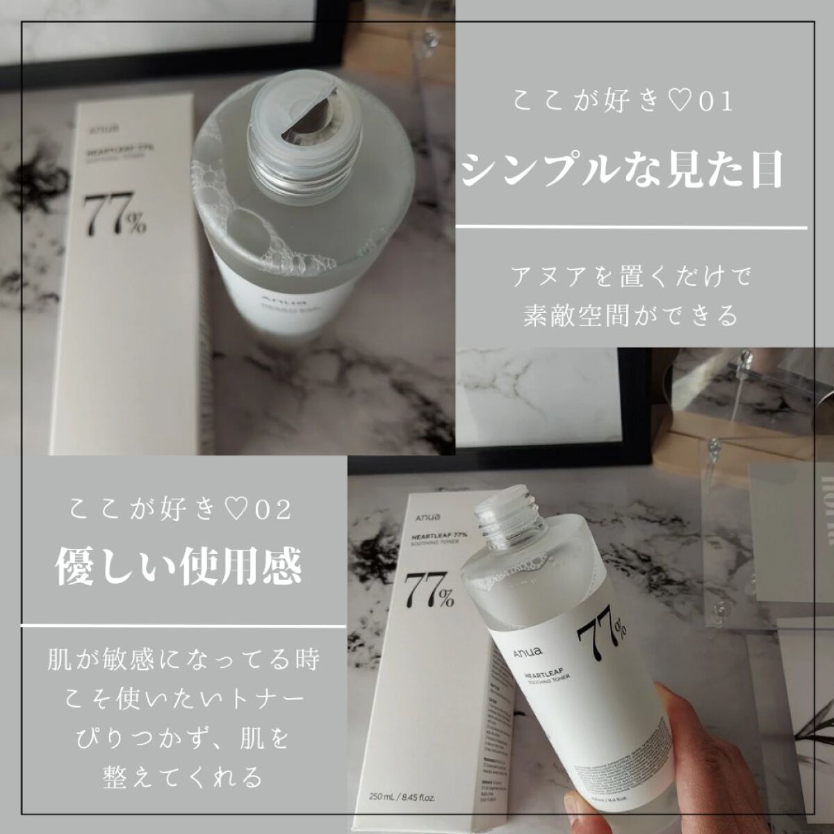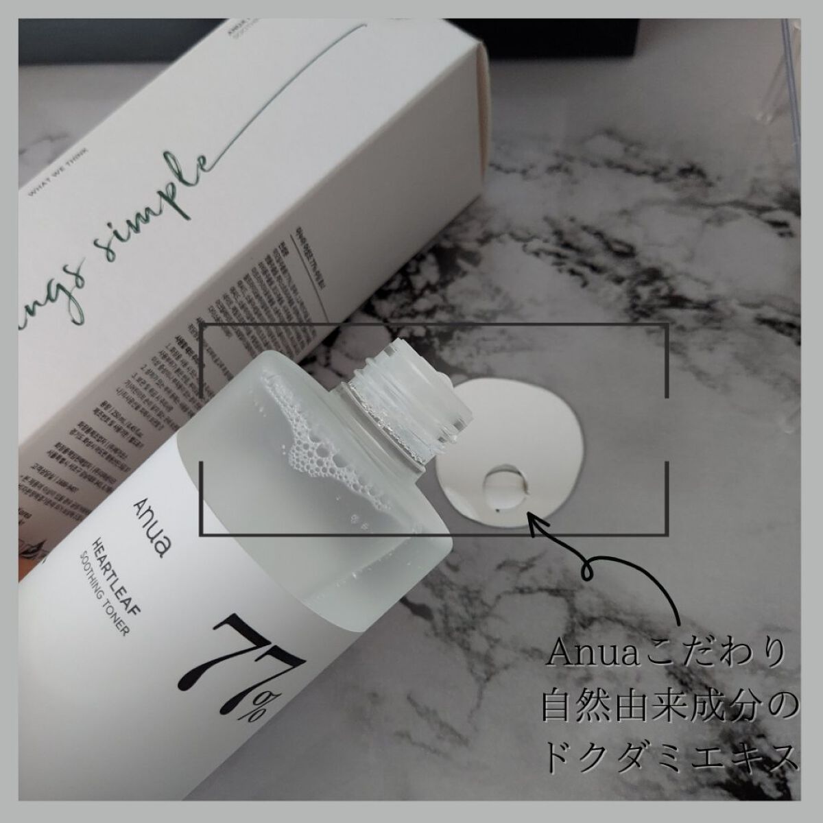 Anuaといえばこちらのトナーですよね✨ こだわった自然由来成分のドクダミエキスを肌に最も適切な比率の77%でたっぷり詰め込んでるそう。 ノンコメドジェニックテスト済み、皮膚刺激性試験で[無刺激]判定を受けているのも敏感肌の方から好まれる理由のの一つ。 サラッとしたテクスチャーでみずみずしい使い心地です。