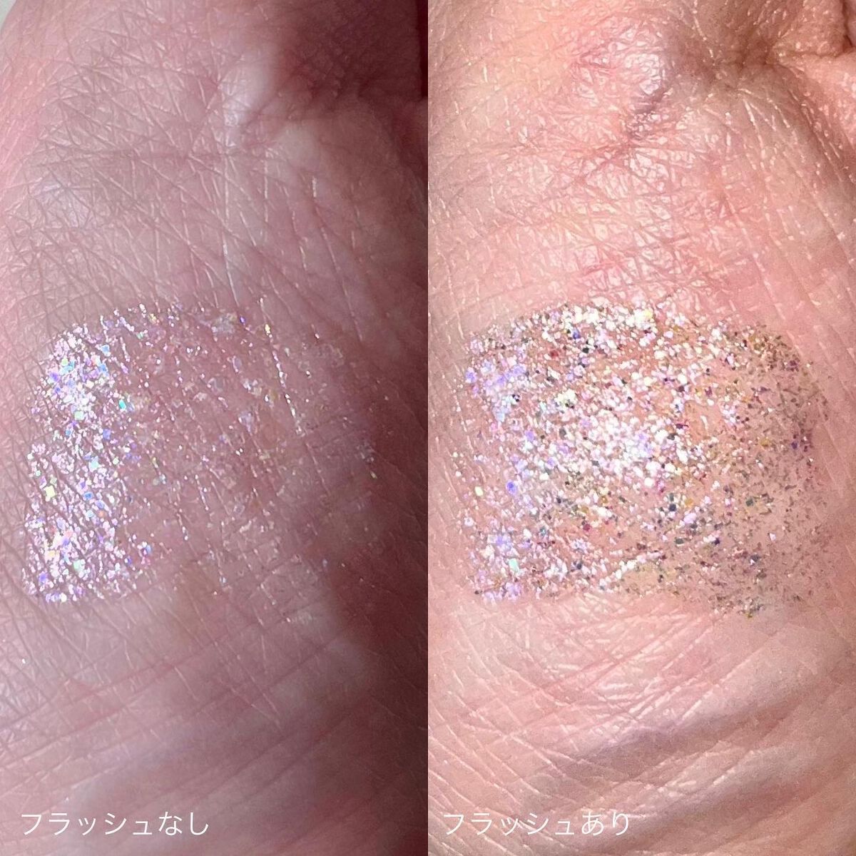 ピンクが主な中に多色グリッターがざくざく入っているライナー💓🩵🩷 結構ざくざくめで大粒のラメがちらちら輝き眩い輝きを放ちます✨✨ フラッシュたいて撮るとその輝き感がより分かります!