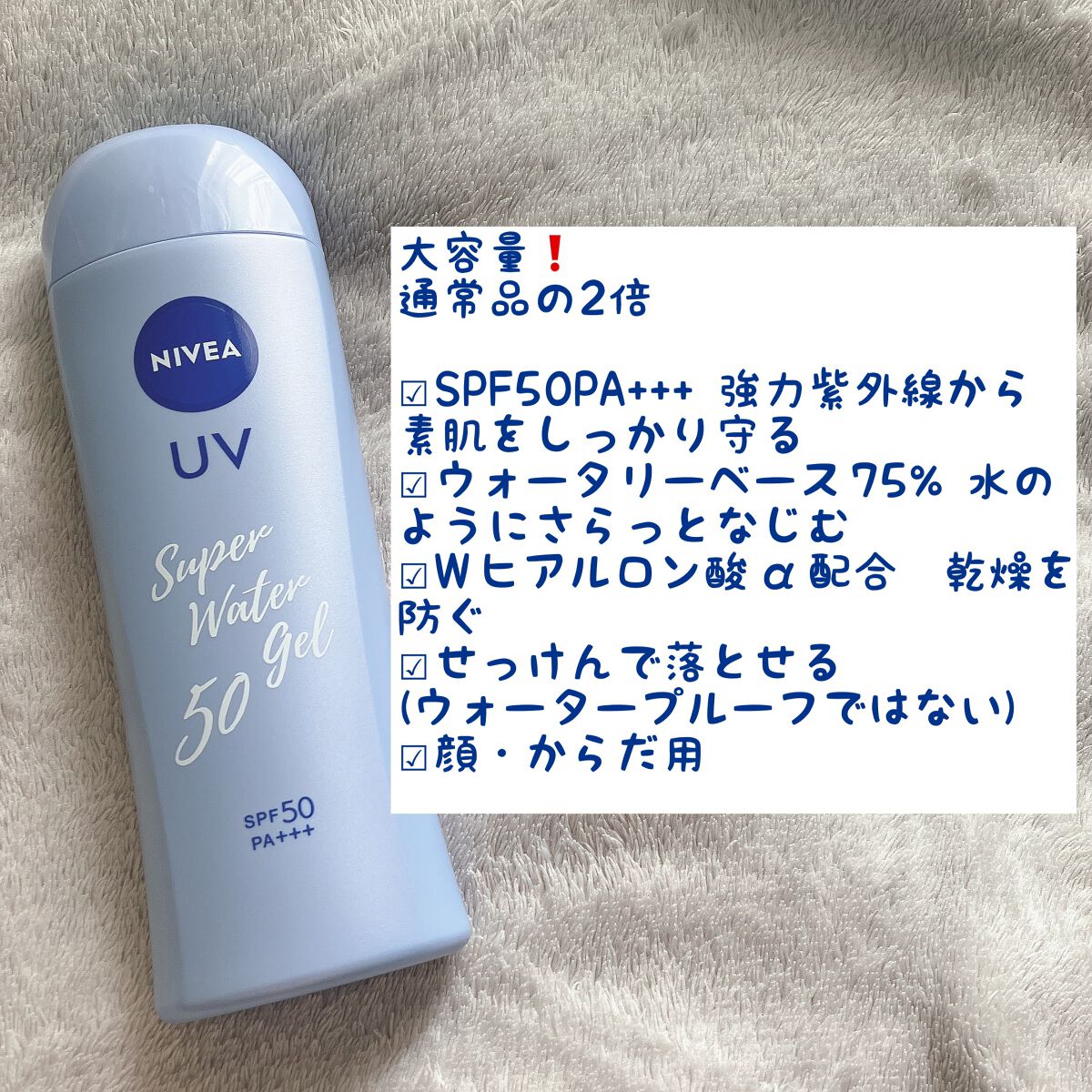 ポンプ式の日焼け止めで価格安めのもの探してて、見つけたのがこれ!ニベアニベアUVウォータージェルSPF50本体ポンプ140g日焼け止めっぽさ本当になしで、とっっっても使いやすい!緩めの乳液みたいなテクスチャー。ベタベタなし、キシキシなしで大好...