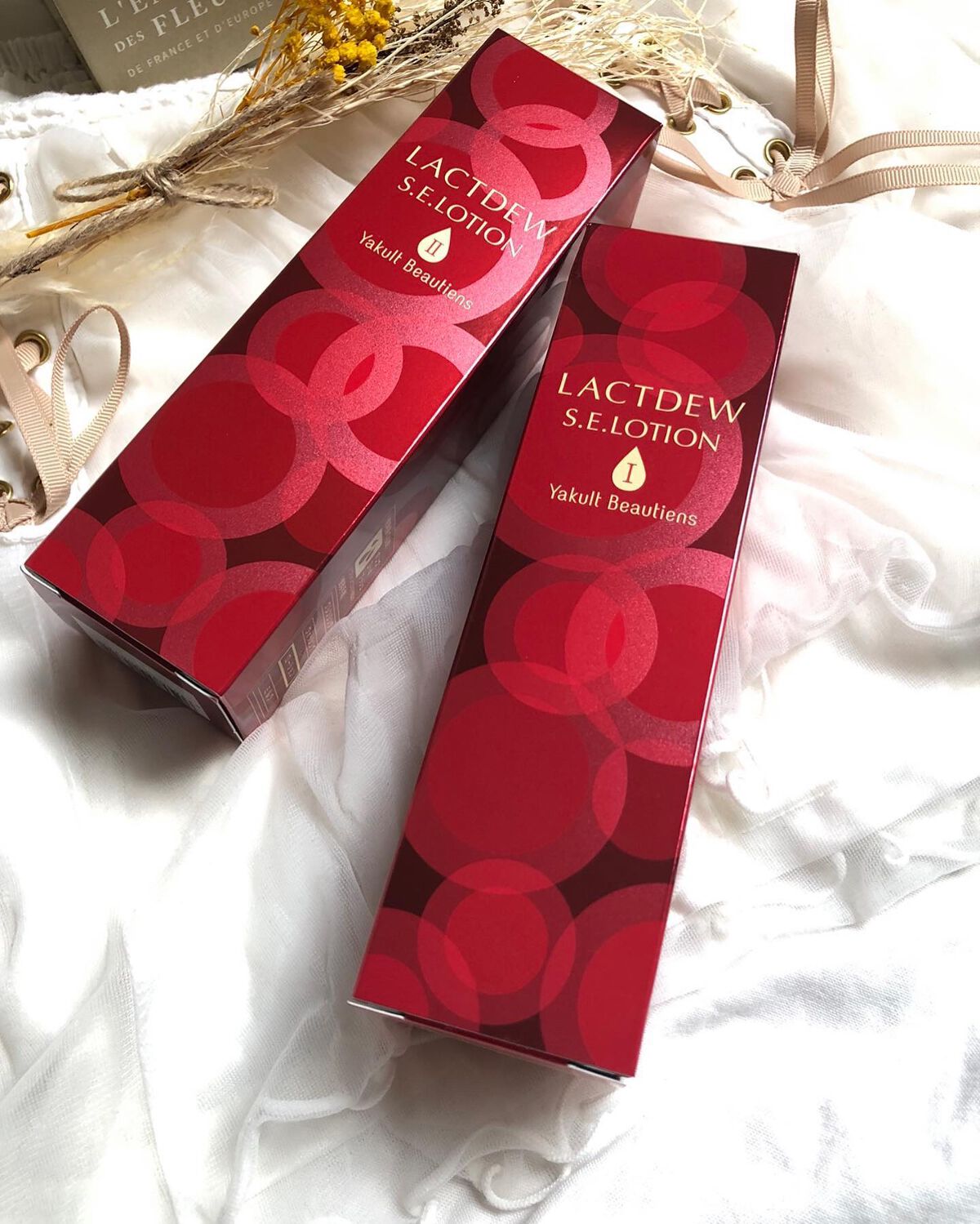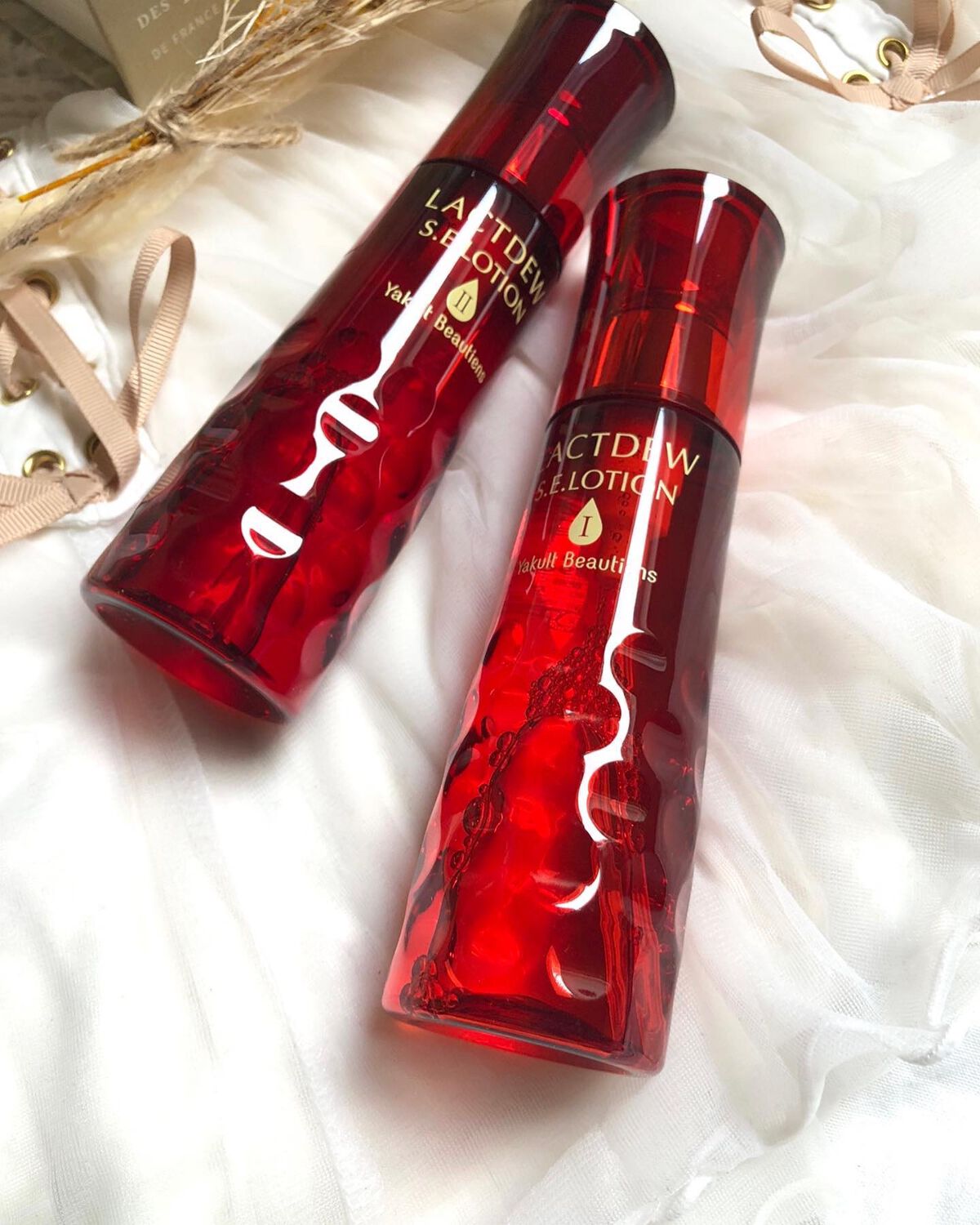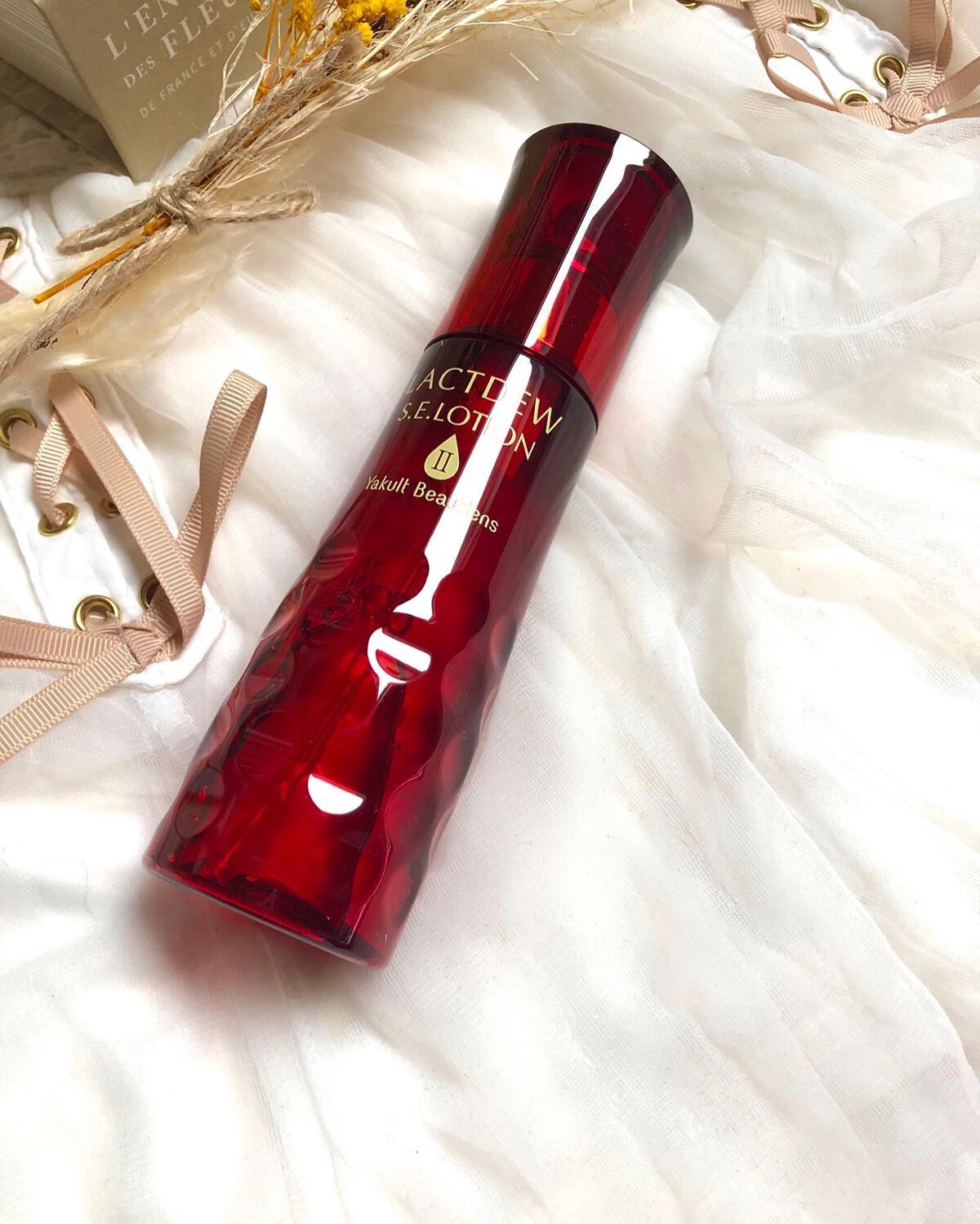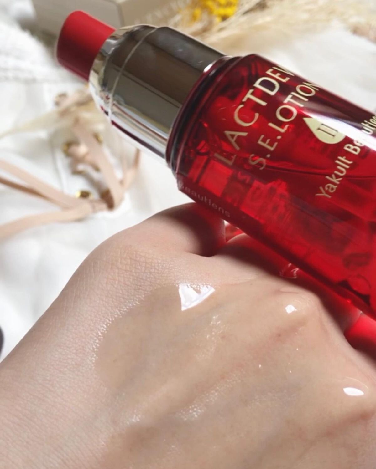 華やかな赤いボトルが素敵。 光に当たるとキラキラしてすごく綺麗なんです✨ こちらはあのヤクルトがつくった化粧水。乳酸菌がつくりだすうるおい成分に、お肌を守る働きがあるんだそう! なじませるとしっとりもっちりするような感触。 ベタつきがほぼ残らないところも◎