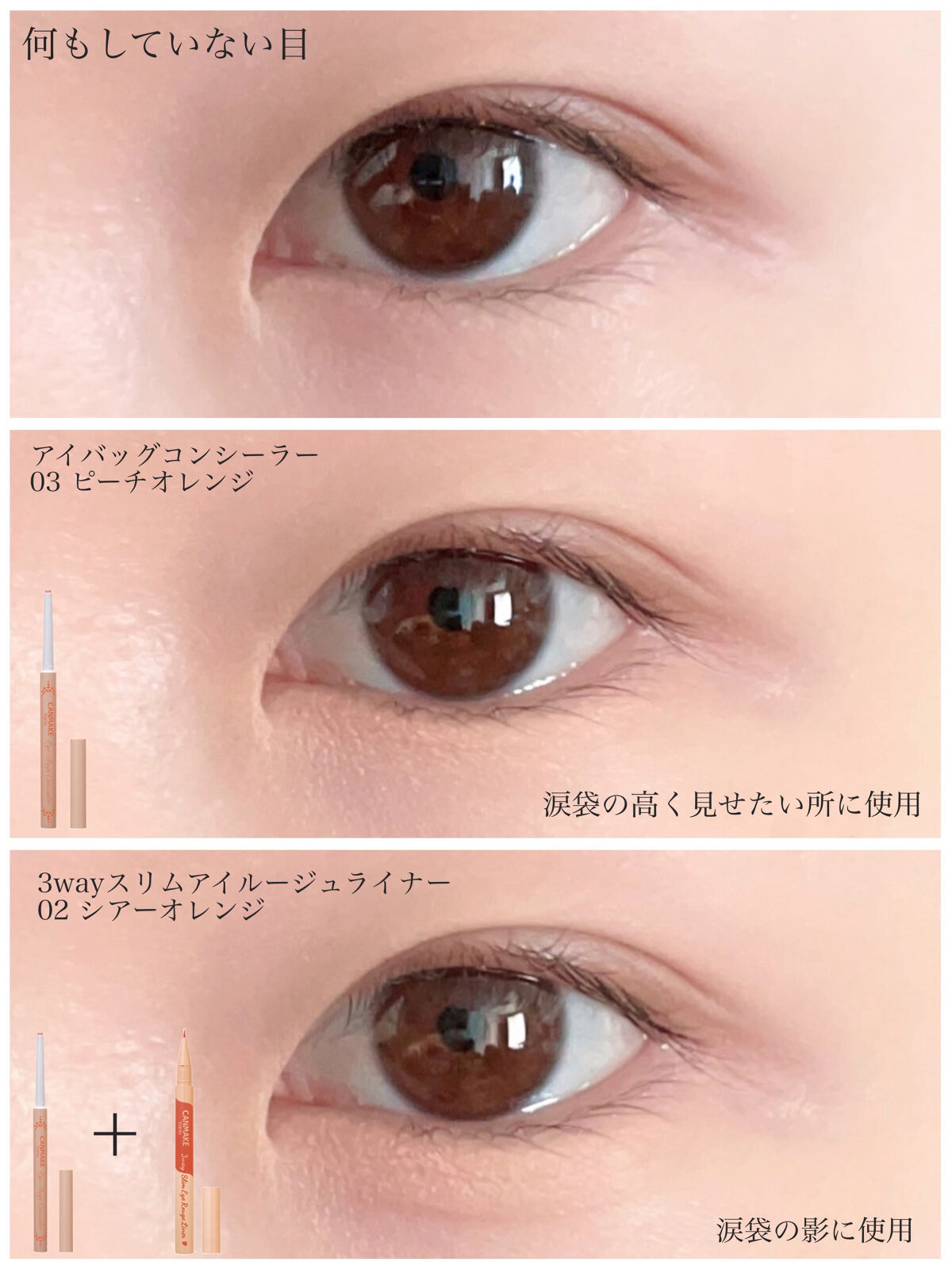 【アイバックコンシーラー】なんですが5月下旬に発売される新商品です‼️ 使い方としては、①涙袋をぷっくり見せたい部分にラインを描く。②描いたあとすぐに指でぼかすと、生まれつき風の涙袋に💓 【3wayスリムアイルージュライナー01】なんですが、こちらの色はアイバックコンシーラー02と相性抜群でした😳 涙袋の影、ふたえ強調、アイライン、下まつげの際にちょんちょん描いて血色感ある目元にしたりするかなって思いました。 涙袋に塗って上からラメを重ねて泣き腫らしたような目元に見せるやり方もあるみたいです。 ナチュラルに涙袋を見せたいならアイバッグコンシーラーだけで、より涙袋を強調させたいなら3wayスリムアイルージュライナーを組み合わせたら涙袋爆誕です‼️✨ どちらも耐久性に優れているのでヨレにくいのが嬉しいポイント✨ 私はピンクメイクすることが多いのでこちらのカラーをお試しさせていただけて丁度良かったです‼️ オレンジメイクをすることが多い方ならもう一色の方をおすすめします😍😍