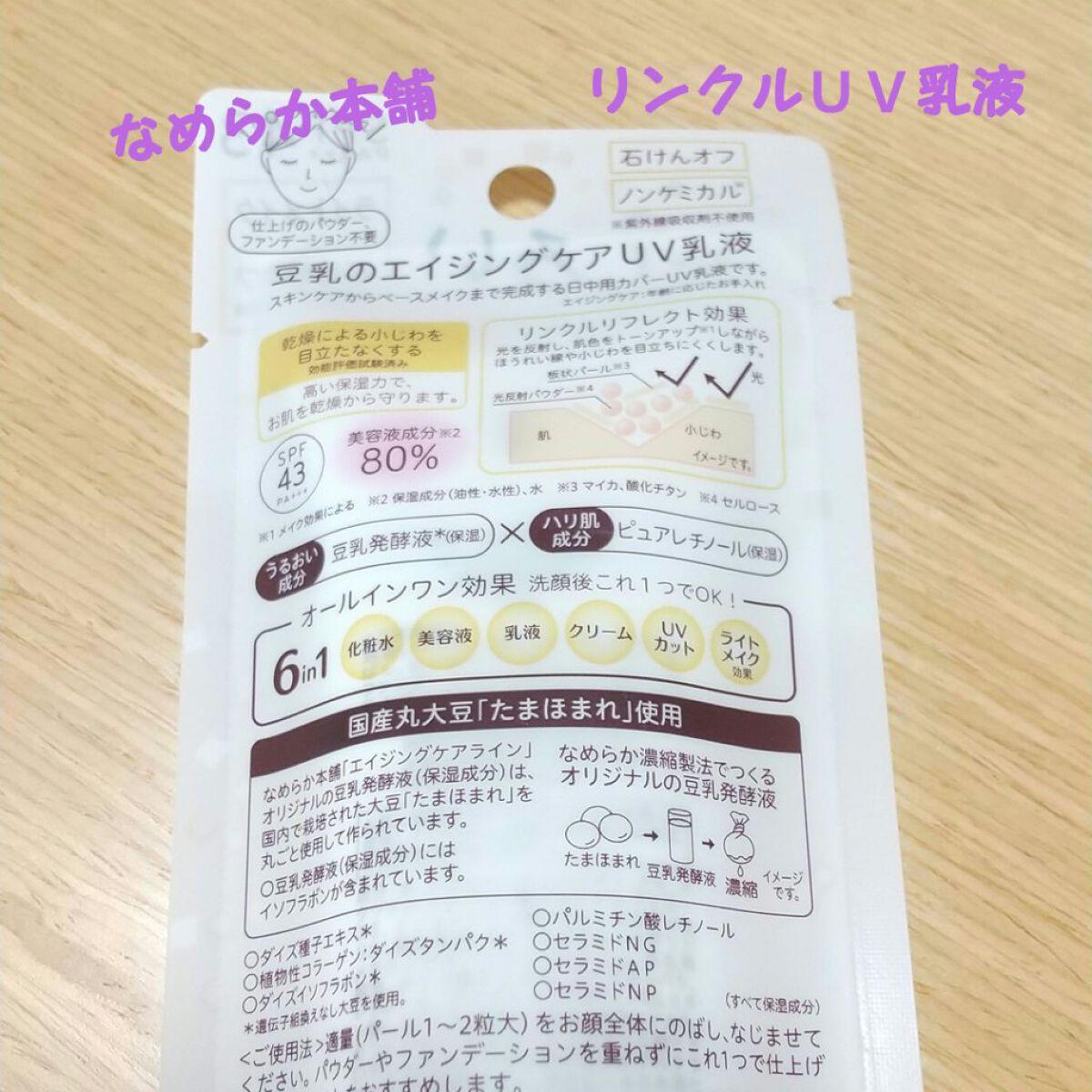 なめらか本舗リンクルUV乳液 は少し乾燥感じる。伸びが悪い。 UVウルトラフィットベースEX は瑞々しすぎて、崩れやすい。 手の甲で2つを混ぜて使用、 その後、 プレストパウダーか、ルースパウダー使用してます。😊