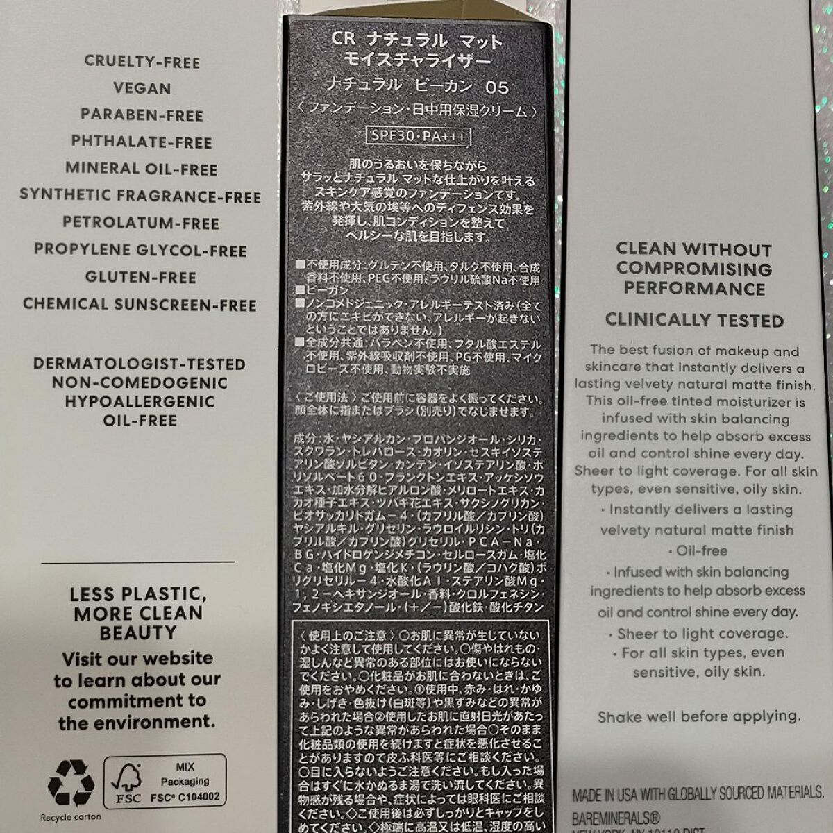 肌にピュア、地球にクリーンなビーガンフォーミュラで、「つけないよりも、肌に良い」ファンデーションを追求するベアミネラルより、CRシリーズの新しい多機能ベース“CR ナチュラル マット モイスチャライザー”が登場。 かなりマットな仕上がり。一日中テカらなかったのに乾燥しなかったです✨ 私的には、ファンデーションとしてじゃなく、UVケアできる色付きクリームみたいな感覚でいたほうがいいかもなって思いました😢