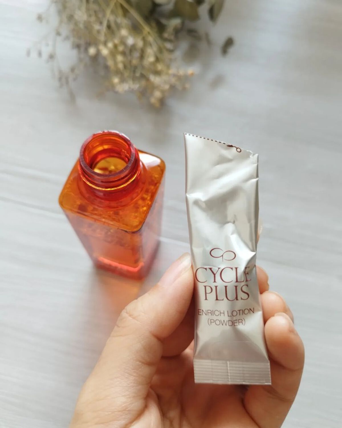 サイクルプラスエンリッチローションパウダー使用前に混ぜる高浸透型ビタミンC誘導体が肌を引き締めます。パウダーを化粧水に入れてボトルを良く振り、パウダーが良く溶けてから使用するユニークなタイプの化粧水です。化粧水は透明で香りもありません。自分で...