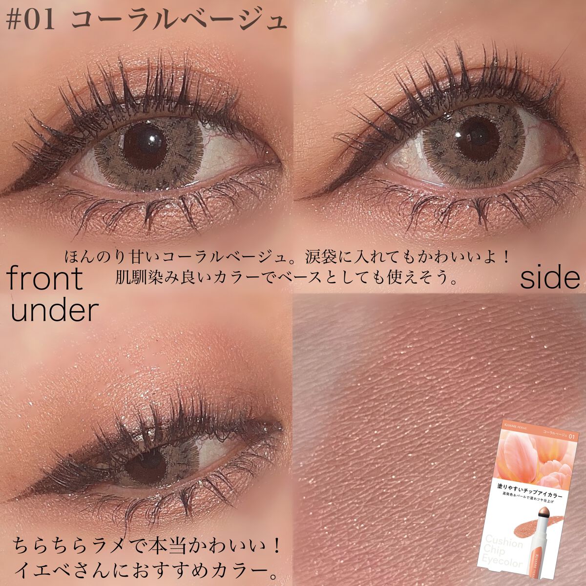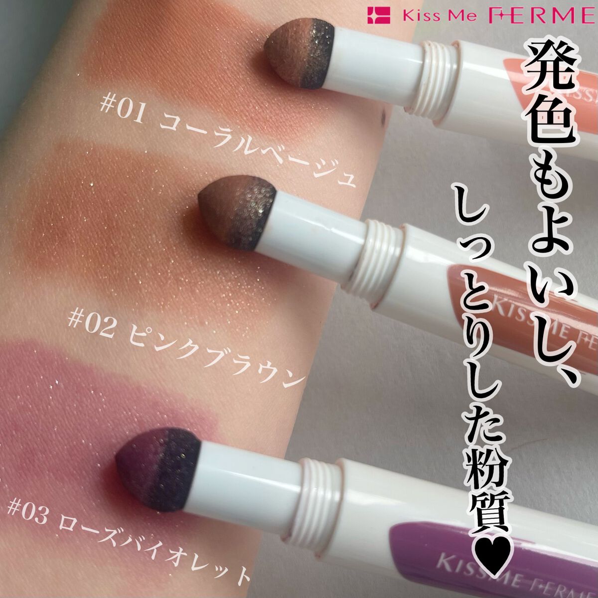 ブランド:KISSMEFERMEキスミーフェルム品名:クッションチップアイカラーN色:01コーラルベージュ/02ピンクブラウン価格(税込み):各1,320円・無香料・美容液成分配合・皮膚刺激テスト済み・光拡散パウダー配合・しっとりスフレ処方・...