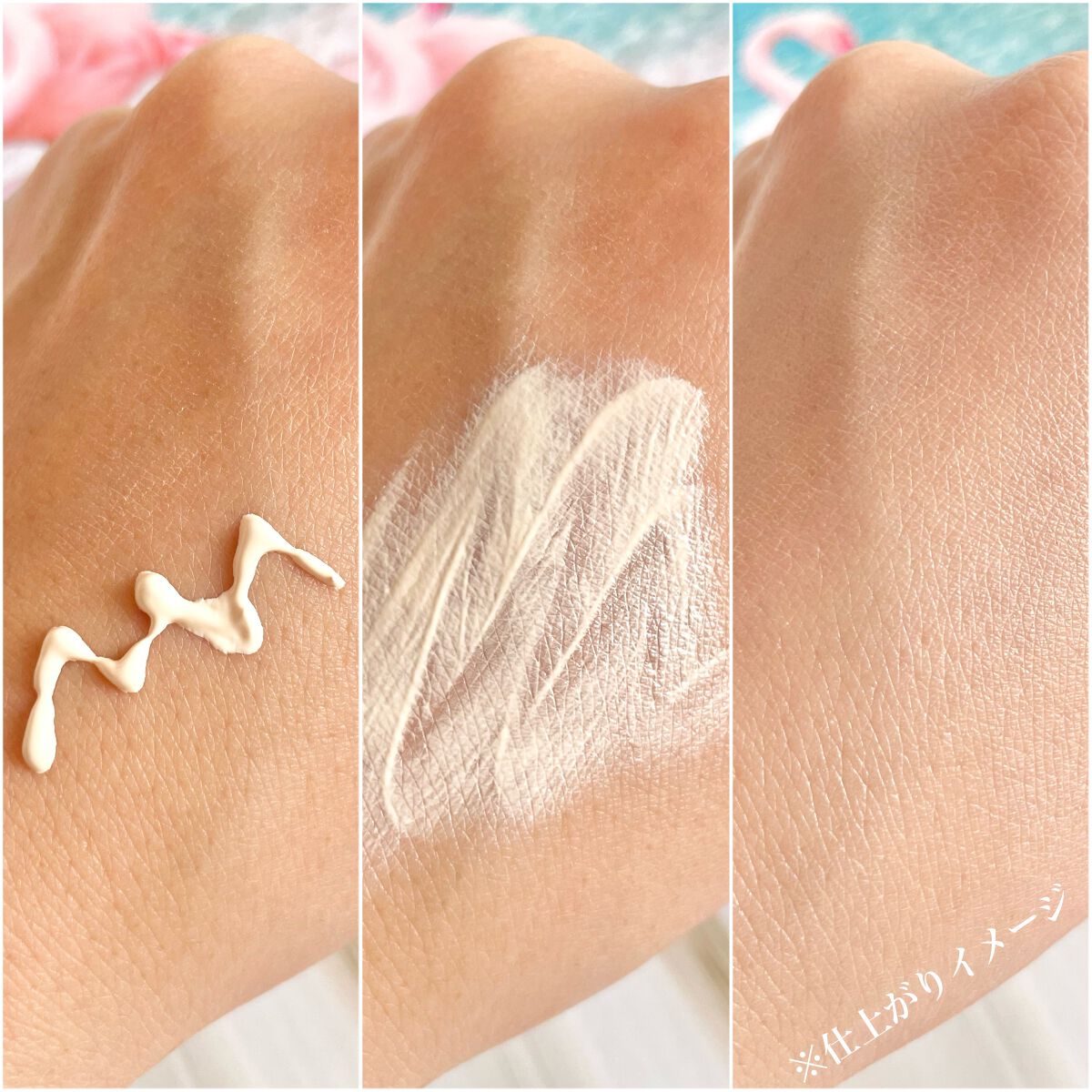 ファンデが要らないぐらいカバー力があるし、厚塗り感なくてみずみずしかった(* ᴗ͈ˬᴗ͈)”, “日やけ止めだけで至近距離でも毛穴が目立たない仕上がりへシアーベージュのノーファンデUVセット 美容液成分(保湿)配合ヒアルロン酸Na