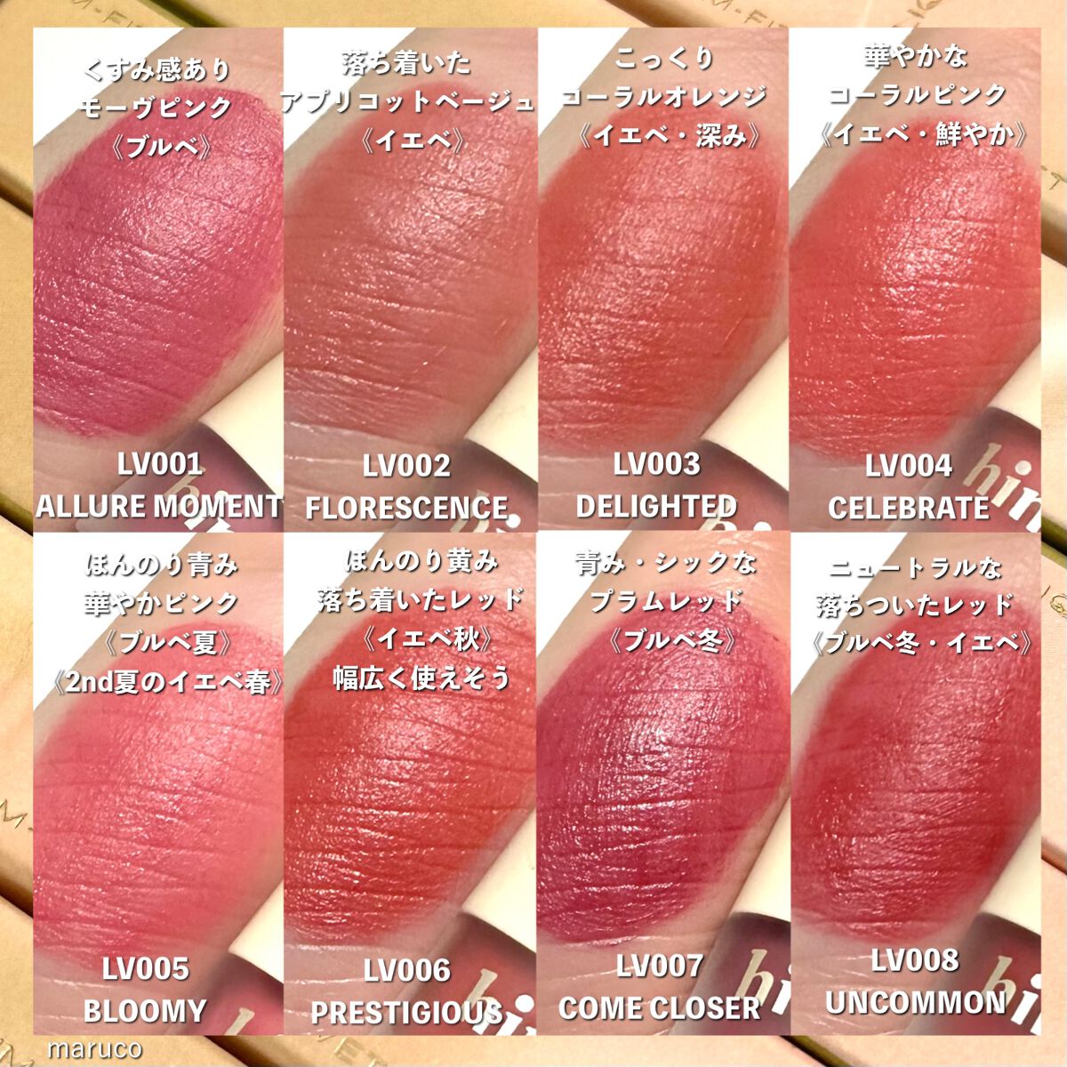 - <LV001 アリュールモーメント> ジメチコン、水、イソドデカン、トリメチルシロキシケイ酸、ジメチコンクロスポリマー、BG、セチルPEG/PPG-10/1ジメチコン、(ビニルジメチコン/メチコンシルセスキオキサン)クロスポリマー、リンゴ酸ジイソステアリル、ペンチレングリコール、マイカ、酸化チタン、トリイソステアリン酸ポリグリセリル-2、(ジメチコン/ビニルジメチコン)クロスポリマー、酸化鉄、グリセリン、カオリン、PEG-10ジメチコン、シリカ、フェノキシエタノール、赤202、ジイソステアリン酸ポリグリセリル-2、青1、エチルヘキシルグリセリン、トリエトキシカプリリルシラン、赤227、香料、エチレンジアミンジコハク酸3Na <LV002 フローレッセンス> ジメチコン、水、イソドデカン、トリメチルシロキシケイ酸、ジメチコンクロスポリマー、BG、セチルPEG/PPG-10/1ジメチコン、(ビニルジメチコン/メチコンシルセスキオキサン)クロスポリマー、ペンチレングリコール、マイカ、リンゴ酸ジイソステアリル、酸化チタン、(ジメチコン/ビニルジメチコン)クロスポリマー、トリイソステアリン酸ポリグリセリル-2、酸化鉄、グリセリン、カオリン、PEG-10ジメチコン、シリカ、フェノキシエタノール、赤202、ジイソステアリン酸ポリグリセリル-2、エチルヘキシルグリセリン、トリエトキシカプリリルシラン、青1、香料、エチレンジアミンジコハク酸3Na、赤227、黄5 <LV003 ディライティド> ジメチコン、水、イソドデカン、トリメチルシロキシケイ酸、ジメチコンクロスポリマー、BG、セチルPEG/PPG-10/1ジメチコン、(ビニルジメチコン/メチコンシルセスキオキサン)クロスポリマー、ペンチレングリコール、リンゴ酸ジイソステアリル、マイカ、酸化鉄、トリイソステアリン酸ポリグリセリル-2、酸化チタン、(ジメチコン/ビニルジメチコン)クロスポリマー、グリセリン、カオリン、PEG-10ジメチコン、シリカ、フェノキシエタノール、赤202、ジイソステアリン酸ポリグリセリル-2、エチルヘキシルグリセリン、トリエトキシカプリリルシラン、黄5、香料、エチレンジアミンジコハク酸3Na、赤227 <LV004 セレブレート> ジメチコン、水、イソドデカン、トリメチルシロキシケイ酸、ジメチコンクロスポリマー、BG、セチルPEG/PPG-10/1ジメチコン、(ビニルジメチコン/メチコンシルセスキオキサン)クロスポリマー、ペンチレングリコール、マイカ、リンゴ酸ジイソステアリル、(ジメチコン/ビニルジメチコン)クロスポリマー、酸化鉄、酸化チタン、トリイソステアリン酸ポリグリセリル-2、グリセリン、カオリン、PEG-10ジメチコン、シリカ、フェノキシエタノール、赤202、ジイソステアリン酸ポリグリセリル-2、エチルヘキシルグリセリン、トリエトキシカプリリルシラン、香料、エチレンジアミンジコハク酸3Na、赤104(1) <LV005 ブルーミー> ジメチコン、水、イソドデカン、トリメチルシロキシケイ酸、ジメチコンクロスポリマー、BG、セチルPEG/PPG-10/1ジメチコン、(ビニルジメチコン/メチコンシルセスキオキサン)クロスポリマー、ペンチレングリコール、マイカ、リンゴ酸ジイソステアリル、酸化チタン、(ジメチコン/ビニルジメチコン)クロスポリマー、トリイソステアリン酸ポリグリセリル-2、グリセリン、カオリン、PEG-10ジメチコン、酸化鉄、シリカ、フェノキシエタノール、赤202、ジイソステアリン酸ポリグリセリル-2、エチルヘキシルグリセリン、トリエトキシカプリリルシラン、香料、青1、エチレンジアミンジコハク酸3Na、赤227、黄5、赤104(1) <LV006 プレスティージャス> ジメチコン、水、イソドデカン、トリメチルシロキシケイ酸、ジメチコンクロスポリマー、BG、セチルPEG/PPG-10/1ジメチコン、(ビニルジメチコン/メチコンシルセスキオキサン)クロスポリマー、ペンチレングリコール、マイカ、トリイソステアリン酸ポリグリセリル-2、酸化鉄、(ジメチコン/ビニルジメチコン)クロスポリマー、リンゴ酸ジイソステアリル、グリセリン、カオリン、PEG-10ジメチコン、シリカ、酸化チタン、フェノキシエタノール、赤202、ジイソステアリン酸ポリグリセリル-2、エチルヘキシルグリセリン、トリエトキシカプリリルシラン、香料、青1、エチレンジアミンジコハク酸3Na、黄5、赤227 <LV007 カム・クローサー> ジメチコン、水、イソドデカン、トリメチルシロキシケイ酸、ジメチコンクロスポリマー、BG、セチルPEG/PPG-10/1ジメチコン、(ビニルジメチコン/メチコンシルセスキオキサン)クロスポリマー、ペンチレングリコール、マイカ、トリイソステアリン酸ポリグリセリル-2、リンゴ酸ジイソステアリル、(ジメチコン/ビニルジメチコン)クロスポリマー、グリセリン、カオリン、PEG-10ジメチコン、酸化チタン、シリカ、フェノキシエタノール、黄5、赤227、赤202、ジイソステアリン酸ポリグリセリル-2、青1、酸化鉄、エチルヘキシルグリセリン、トリエトキシカプリリルシラン、香料、エチレンジアミンジコハク酸3Na <LV008 アンコモン> ジメチコン、水、イソドデカン、トリ
