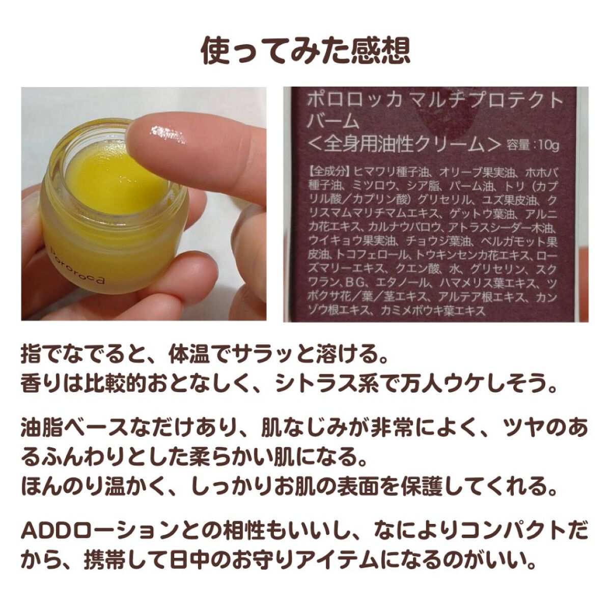 目元・口元、ボディ、髪にまで使えるマルチバーム✨ 生命力溢れる植物オイルの他、ストレスへの対処を助けると言われているホーリバジルや高麗人参などの植物エキスなどを配合したボタニカルバーム🌿 シトラスだけど、スパイシーさもある奥深い香りでキモチの切り替えが出来るような気がして使ってます😊 全植物のうち、2%しか存在しない塩生植物のひとつである、シーフェンネルから抽出した、セラミド合成作用を持つ植物幹細胞エキスを推奨濃度で配合しているのもポイントの1つ✨