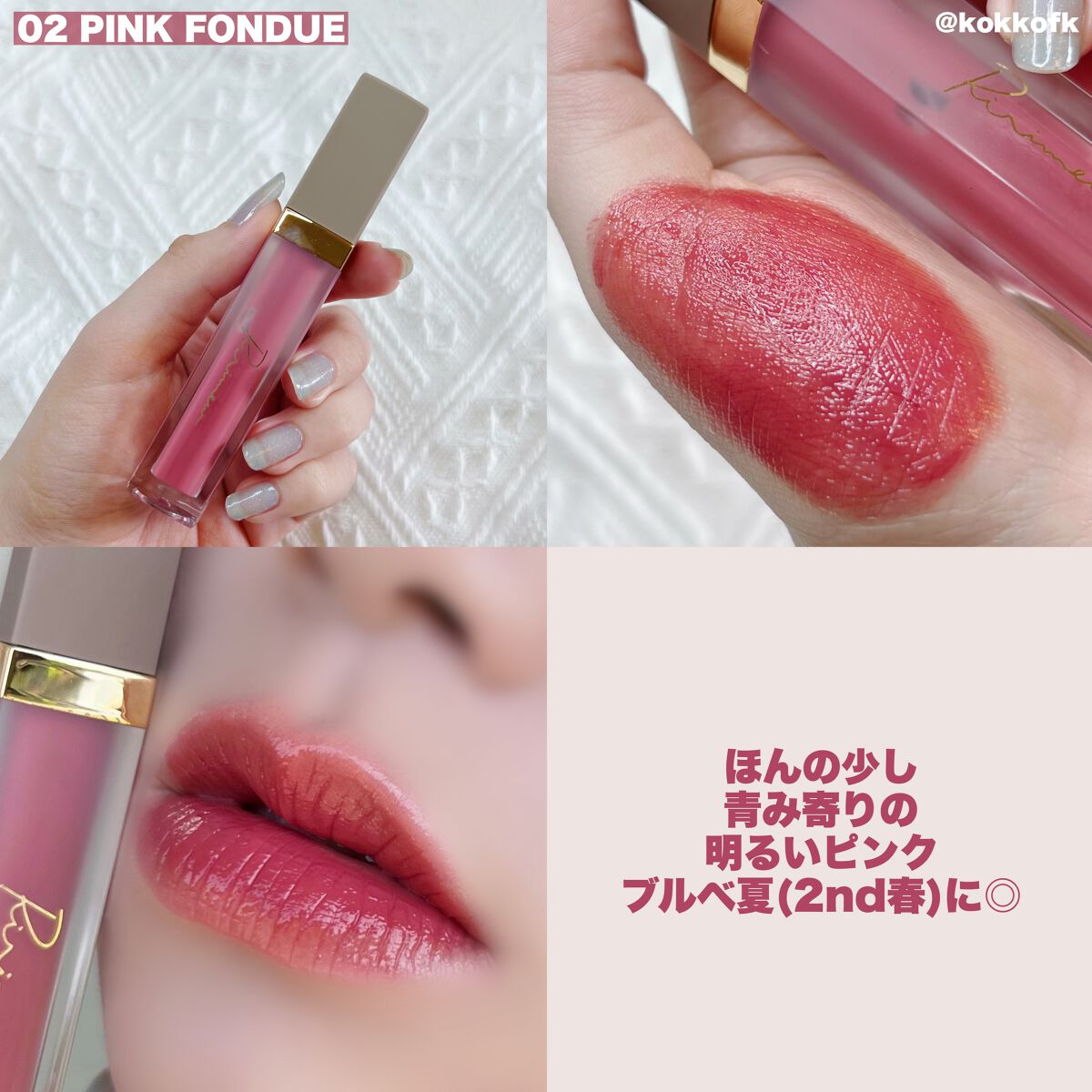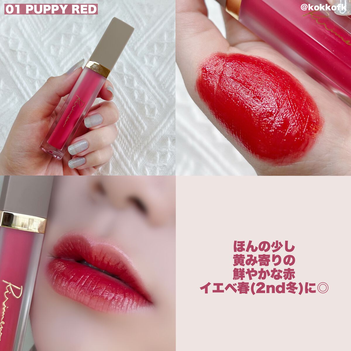 薄く唇に密着する新作マットティント。 マットなのにかなりしっとりとしていて 乾燥を感じなくてびっくりでした! 一気にこなれ感が出るトレンドカラーです♡ やや青みの華やかローズレッド 公式画像より鮮やかめに感じました。 やや黄みの強くて深いオレンジレッド ストロングオータムに超激推しです! やや黄みの非常に深く濃いダークブラウン ディープオータムに激推しです! かわいい雰囲気になれるピンクリップです♡ やや青みの柔らかいくすみピンクベージュ ミューテッドサマーにおすすめです! 青みの落ち着いたローズピンク やや青みのとても鮮やかなビビッドレッド ビビッドウィンターに特におすすめ! 既存マットティントよりもさらに ふわふわなマット感が魅力のリップで、 軽くティッシュオフしてもほとんど落ちない◎ マスクにも激推しのティントなので、 ぜひ皆さんもチェックしてみてね❤︎
