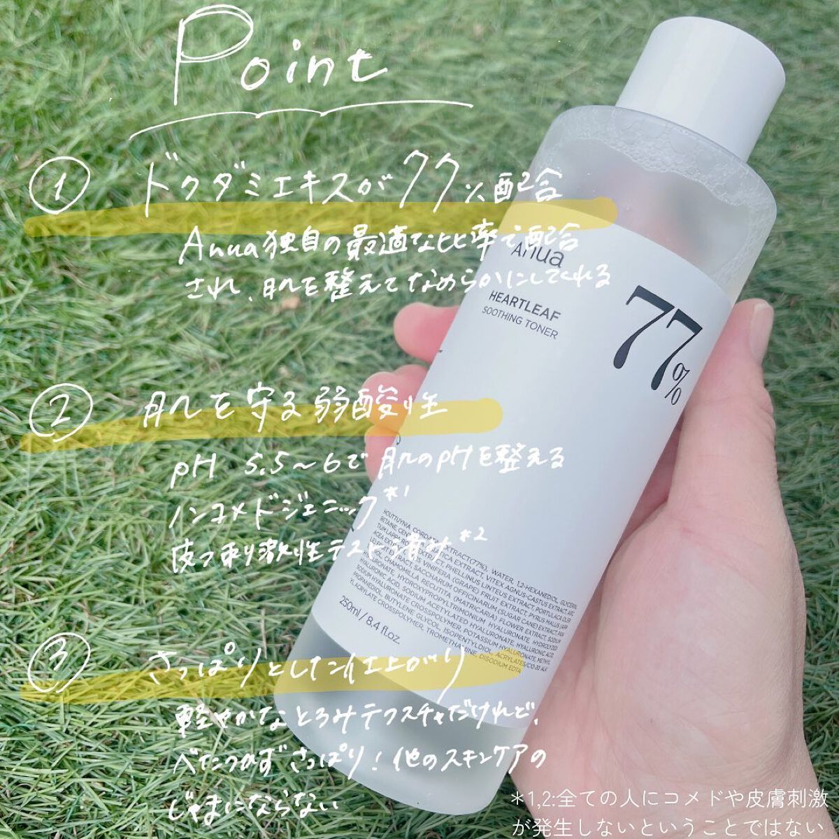 - 天然由来成分のドクダミソウエキスを77%配合し、疲れたお肌やトラブルケアにおすすめです。 「ドクダミ80%スージングアンプル」とセットでご利用いただけます。 ①低刺激テスト完了 敏感なお肌にも安心して使用可能 ②ダメージを受けたお肌を鎮静 ドクダミソウ77%配合で皮膚の鎮静力強化 ③PH5.5弱酸性トナー お肌の内側の崩れた油水分のバランスを調節 ④ニキビ肌に最適 ノンコメドジェニック認証トナー ●低刺激テスト済み ●ノンコメドジェニックテスト済み ●肌鎮静効能臨床テスト結果 トラブル肌試験部位の赤みは11.4%減少、経皮水分損失量は12.97%減少し、肌の鎮静効能が認証されました。