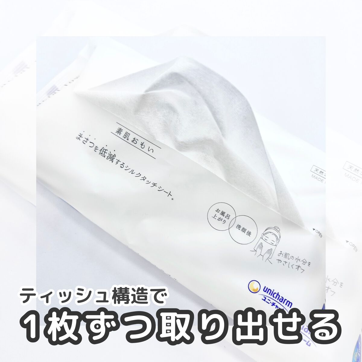 - ① 「まさつ低減」※1とお肌にやさしい印象が伝わるパッケージデザイン ・お客様の重視点でもある「まさつ低減」※1のメッセージが視認できるデザインです。 ・女性のイラストとやわらかなグラデーションのデザインでお肌にやさしい印象をあたえます。 ② 縦型フック穴付き仕様のパッケージ ・フック穴付き仕様にすることで、壁面や扉裏などに収納が可能となり、使用する際に便利です。 ③ お肌への「まさつ低減」※1にこだわった独自の極細繊維を採用したきめ細やかなシート ・一般的な布製タオルのパイル※3の約1/20の極細繊維を使用しています。繊維が細くきめが細かいので、まさつを極力少なくすることができます。 ・毛羽立ちが少ないので、お肌に繊維が残りにくいシートです。 ※3 丸いループ状の糸 ④ フラットな表面でお肌にやさしく密着 ・表面に凹凸がないフラットなシートなので、お肌を包み込むように密着します。 ⑤ 1回でサッと吸収するからこすれにくい ・一般的なティッシュの4倍※2の吸収力で、当てるだけで顔全体の水分を吸い取ることができます。 ・シートは1枚で顔全体を覆う大判厚手タイプ(約200mm×200mm)です。 ⑥ 品質認証・肌テスト実施済み ・シートは、世界最高水準の安全性が確認された繊維商品の証である「STANDARD100 by OEKO-TEX®」認証を取得しています。 ・「ノンコメドジェニックテスト」※4に対応済み※5です。 ※4 「コメド」は、「初期段階のニキビ」「毛穴詰まりを起こした状態」を指す。「ノンコメドジェニックテスト」とは「コメドを発生させにくい製品か否か」を判定する試験のこと ※5 全ての方にコメド(ニキビのもと)が発生しないということではありません ⑦ 「無添加」「石化由来原材料不使用」 ・スキンケア商品に用いられることの多いエタノールやパラベン等の添加物を使用していません。 ・また、石油系合成繊維や蛍光増白剤、接着剤などの石化由来原材料を排除しました。 ※2025年4月15日〜パッケージ・商品名リニューアル 「シルコットフェイシャルタオル 素肌おもい」から「シルコットフェイシャルタオル 素肌おもい プレミアム」へ変更