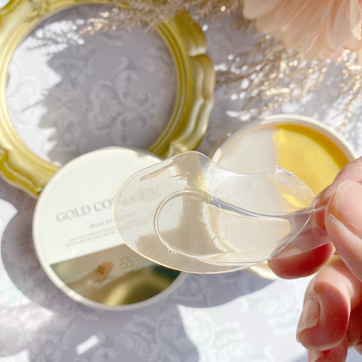 肌のハリツヤ向けのゴールドコラーゲンタイプ 目の下にピッタリとフィットしてくれるタイプです。ゴールドカラーがゴージャス! 気になるくすみにグルタチオンタイプ 形状の違う2つのシートで、目の下用と部分使いできる小さいパッドがセットになっています。 どちらもトロトロした美容液が容器に浸されており、ひんやりとしたプルンとしたテクスチャーで、密着感のあるゲルシートがしっかりフィット!
