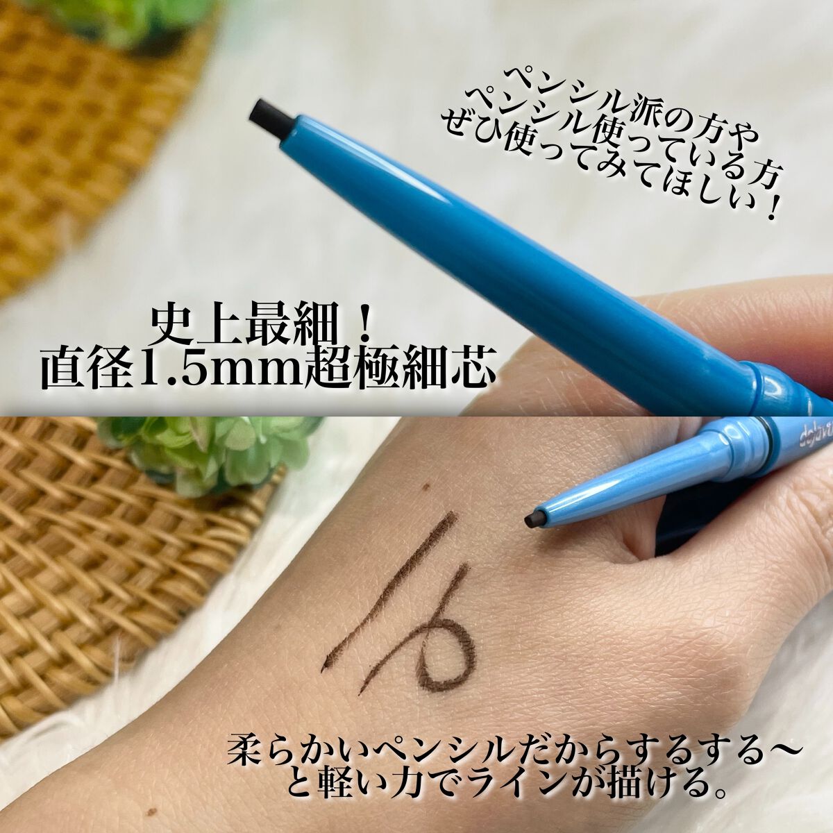 史上最細! 直径1.5mmの超極細芯。 皮脂・汗・涙・擦れに強い スーパーウォータープルーフで滲みにくい。 なめらかな描き心地が最高。 目力と優しさの両立が叶うダークブラウンの発色が好き!