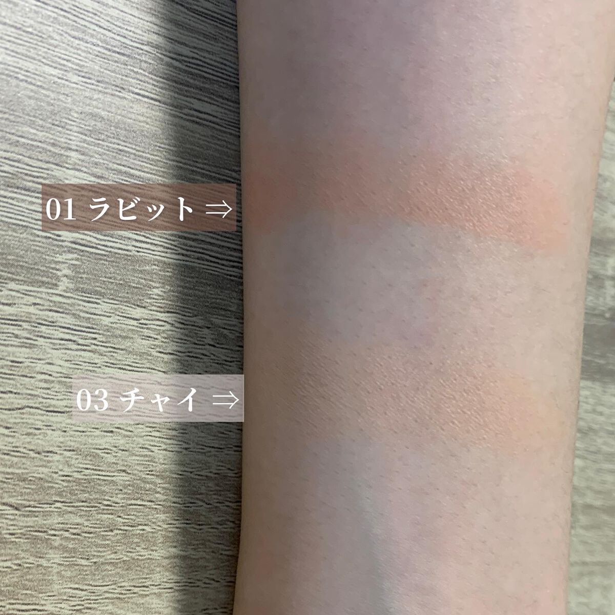 - <01 ラビット> タルク、マイカ、ラウリン酸ヘキシル、酸化チタン、オクテニルコハク酸デンプンAl、コーンスターチ、トリイソステアリン酸ポリグリセリル-2、ジフェニルシロキシフェニルトリメチコン、酸化鉄、ミリスチン酸Mg、メチルプロパンジオール、プロパンジオール、ジメチコン、メチコン、水、カルミン、黄4 <03 チャイ> タルク、マイカ、ラウリン酸ヘキシル、酸化チタン、コーンスターチ、オクテニルコハク酸デンプンAl、トリイソステアリン酸ポリグリセリル-2、酸化鉄、ジフェニルシロキシフェニルトリメチコン、ミリスチン酸Mg、メチルプロパンジオール、プロパンジオール、ジメチコン、黄4、赤226、メチコン、グンジョウ、水 <04 エンジェル> タルク、マイカ、ラウリン酸ヘキシル、酸化チタン、コーンスターチ、オクテニルコハク酸デンプンAl、トリイソステアリン酸ポリグリセリル-2、ジフェニルシロキシフェニルトリメチコン、ミリスチン酸Mg、メチルプロパンジオール、酸化鉄、プロパンジオール、ジメチコン、カルミン、青1、赤226、メチコン、黄4、水