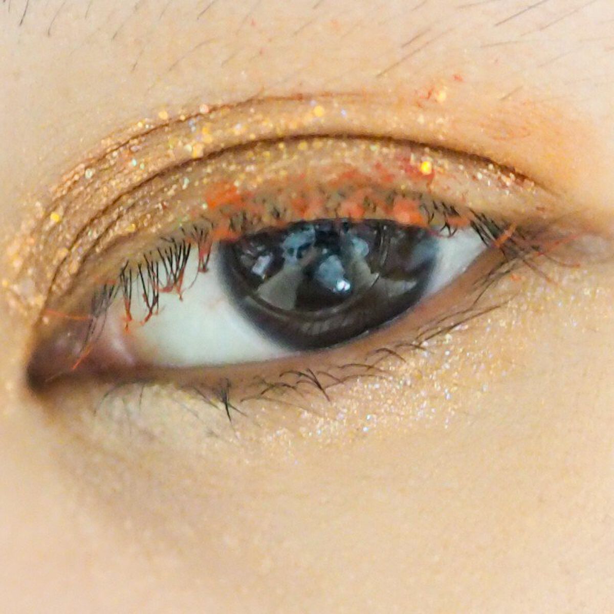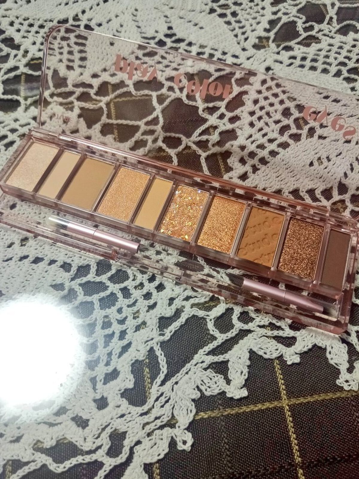 左上のラメは、ゴールドにちょっとピンクがかった?色で派手さこそ無いものの、しっとりとした粉質で瞼に優しく光をくれます。 右上の明るいブラウンは、中間色として使えそうです。ココアのような色でもあるのですが、イエベでも使えます。 左下の濃いブラウンは、締め色として使えます。アイライナー代わりに入れても良さそう。 右下のオレンジは、パッと華やぐ色です。透け感のあるオレンジなので、オレンジメイクが苦手!という方でも使いやすいカラーです。 全体的に温かみのあるカラーで、秋らしいカラーかなと思います。また、透け感が強いので、いかにもマット!というアイシャドウが苦手な方でも使いやすいパレットかと。