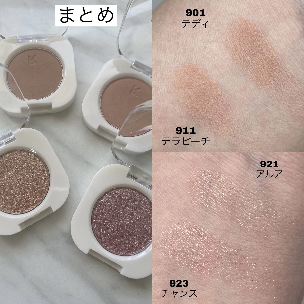 - こだわり抜いた感覚的な色彩の領域、そこで採取した多彩なモノシェード。 積み重ねるほどに深まるマットシャドウから、 清爽にきらめくグリッターまで。 ■ マット(901-920)l 柔らかく広がるふんわりとした塗り心地 柔らかな粒子のパウダーで、 色を重ねると水彩画のようにブレンディングされ、 感覚的な陰影を完成させます。 ■ グリッター(921-926)l 透明なガラスが輝くように反射するグリッター 高い反射率のスーパートゥインクルフォーミュラは、 小さい光でも豊かに輝きます。 動きに応じて光が当たる瞬間、 涼しくはじける水面のように輝きます。