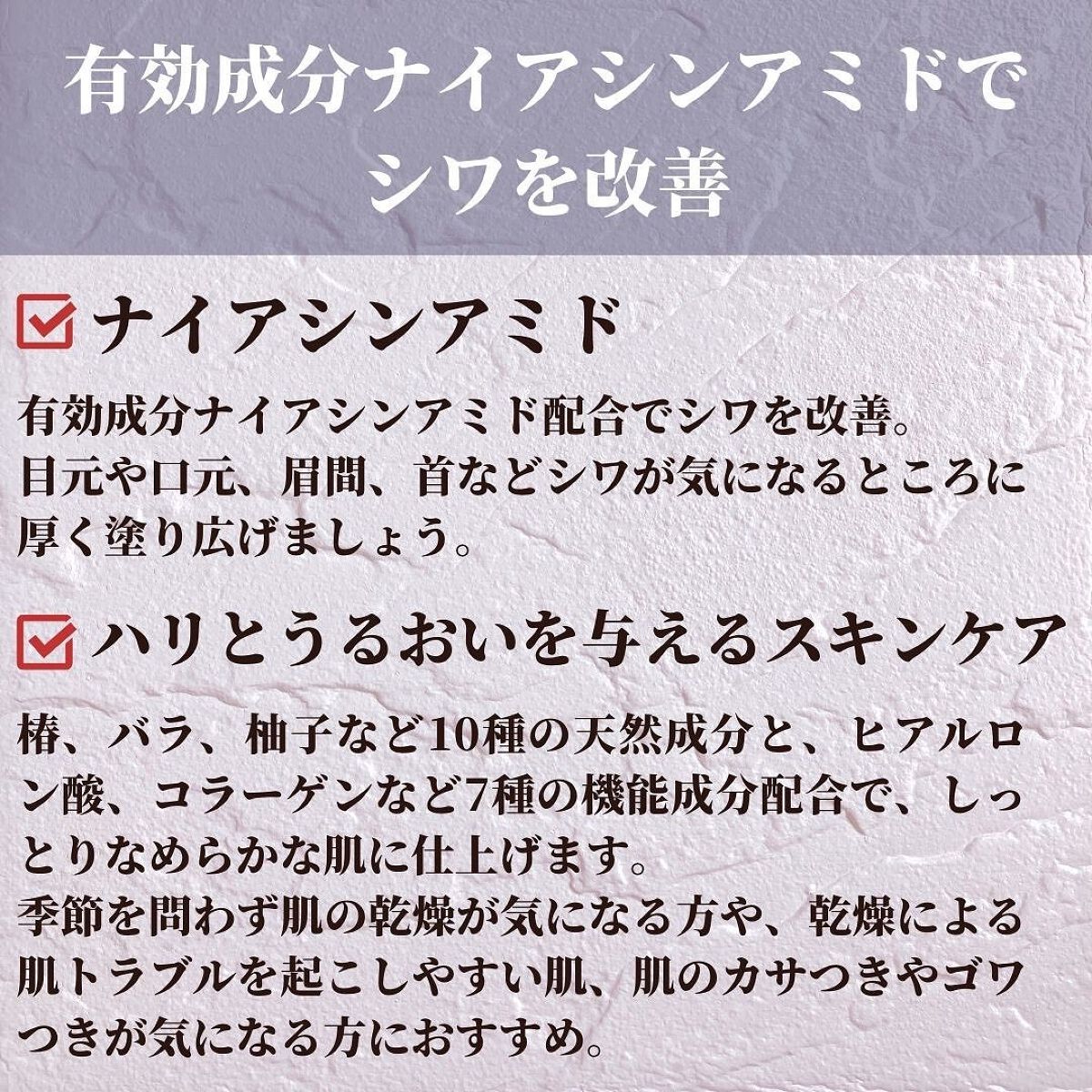 - 岩手県釜石の天然水を使用した薬用スキンケアシリーズです。有効成分として、ナイアシンアミド配合でシワを改善します。椿、桑、柚子、バラなど12種の天然美肌成分と、ヒアルロン酸、コラーゲンなど6種の機能成分配合で、乾燥やシワが気になる肌をふっくらハリのある肌に仕上げます。