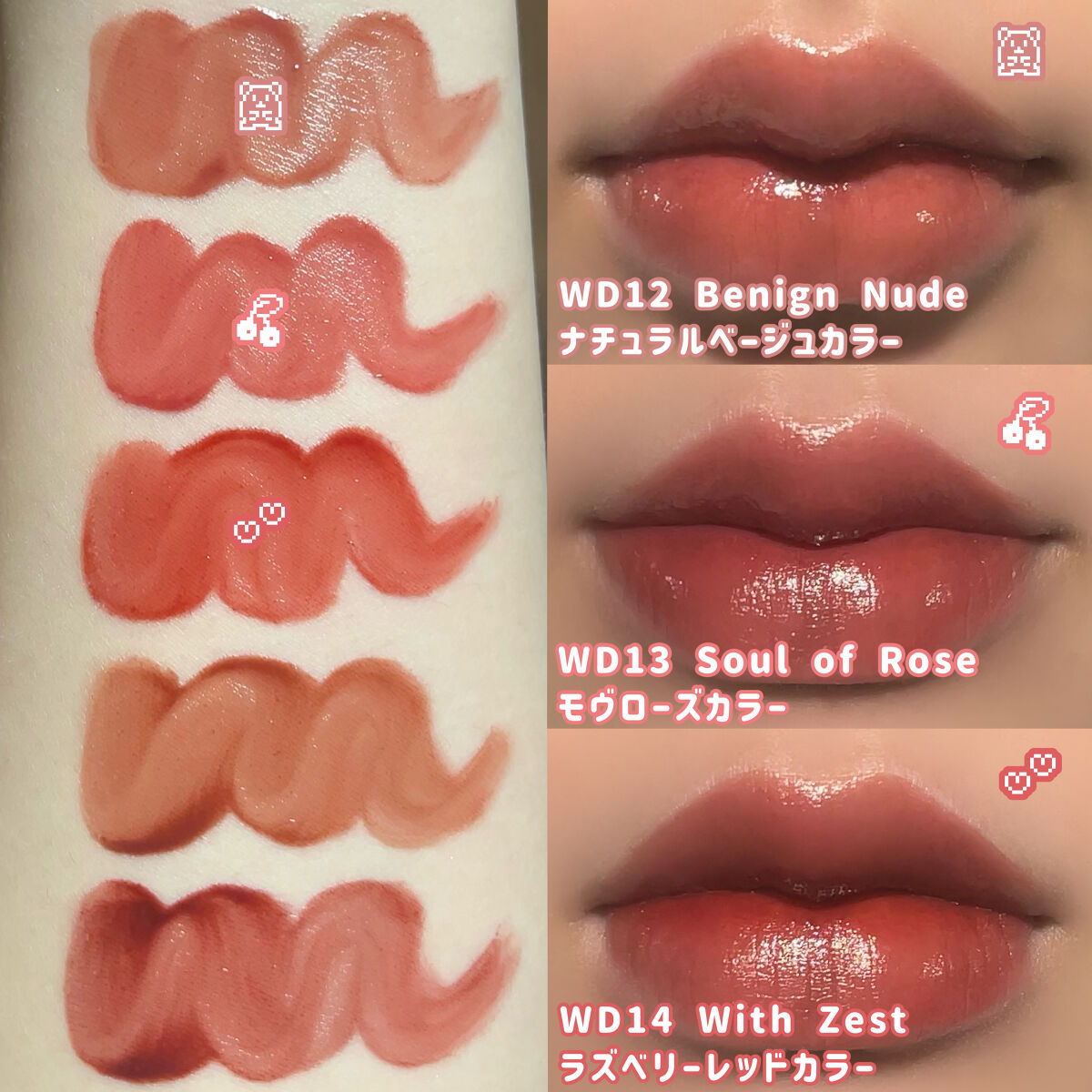 - <WD2 ビトゥン ローズ> 水、ジフェニルジメチコン、リンゴ酸ジイソステアリル、ビスジグリセリルポリアシルアジペート-2、水添ポリイソブテン、ジグリセリン、DPG、セチルPEG/PPG-10/1ジメチコン、イソステアリン酸ソルビタン、ポリソルベート60、ペンチレングリコール、オクチルドデカノール、セテアレス-20、(アクリル酸ヒドロキシエチル/アクリロイルジメチルタウリンNa)コポリマー、スクワラン、フェノキシエタノール、ポリグリセリン-3、ステビオシド、香料、エチルヘキシルグリセリン、グリセリン、シア脂、ツバキ種子油、トリ(カプリル酸/カプリン酸)グリセリル、アルガニアスピノサ核油、ホホバ種子油、アーモンド油、アンズ核油、月見草油、オリーブ果実油、テトラ(ジ-t-ブチルヒドロキシヒドロケイヒ酸)ペンタエリスリチル、カニナバラ果実エキス、マンゴー果実エキス、赤104(1)、赤227、黄5、青1 <WD3 ピンク ヘイズ> 水、ジフェニルジメチコン、リンゴ酸ジイソステアリル、ビスジグリセリルポリアシルアジペート-2、水添ポリイソブテン、ジグリセリン、DPG、セチルPEG/PPG-10/1ジメチコン、イソステアリン酸ソルビタン、ポリソルベート60、ペンチレングリコール、オクチルドデカノール、セテアレス-20、(アクリル酸ヒドロキシエチル/アクリロイルジメチルタウリンNa)コポリマー、スクワラン、フェノキシエタノール、ポリグリセリン-3、ステビオシド、香料、エチルヘキシルグリセリン、グリセリン、水酸化Al、ポリアクリル酸アンモニウム、BG、アルガニアスピノサ核油、シア脂、ツバキ種子油、トリ(カプリル酸/カプリン酸)グリセリル、アーモンド油、アンズ核油、ホホバ種子油、月見草油、オリーブ果実油、テトラ(ジ-t-ブチルヒドロキシヒドロケイヒ酸)ペンタエリスリチル、マンゴー果実エキス、カニナバラ果実エキス、酸化チタン、赤104(1)、赤227、黄5、青1 <WD4 オールウェイズ ヤング> 水、ジフェニルジメチコン、リンゴ酸ジイソステアリル、ビスジグリセリルポリアシルアジペート-2、水添ポリイソブテン、ジグリセリン、DPG、セチルPEG/PPG-10/1ジメチコン、イソステアリン酸ソルビタン、ポリソルベート60、ペンチレングリコール、オクチルドデカノール、セテアレス-20、(アクリル酸ヒドロキシエチル/アクリロイルジメチルタウリンNa)コポリマー、スクワラン、フェノキシエタノール、ポリグリセリン-3、ステビオシド、香料、エチルヘキシルグリセリン、グリセリン、シア脂、ツバキ種子油、トリ(カプリル酸/カプリン酸)グリセリル、アルガニアスピノサ核油、ホホバ種子油、アーモンド油、アンズ核油、月見草油、オリーブ果実油、テトラ(ジ-t-ブチルヒドロキシヒドロケイヒ酸)ペンタエリスリチル、カニナバラ果実エキス、マンゴー果実エキス、赤104(1)、赤227、黄5、青1 <WD6 クラッシュド パンプキン> 水、水添ポリイソブテン、リンゴ酸ジイソステアリル、ビスジグリセリルポリアシルアジペート-2、ジフェニルシロキシフェニルトリメチコン、ジフェニルジメチコン、ポリグリセリン-3、オクチルドデカノール、ポリソルベート60、セチルPEG/PPG-10/1ジメチコン、ラウリン酸ポリグリセリル-10、ペンチレングリコール、1,2-ヘキサンジオール、(アクリル酸ヒドロキシエチル/アクリロイルジメチルタウリンNa)コポリマー、PEG-60水添ヒマシ油、セテアリルアルコール、スクワラン、キシリトール、エチルヘキシルグリセリン、香料、ポリアクリル酸アンモニウム、イソステアリン酸ソルビタン、水酸化Al、フェノキシエタノール、BG、トコフェロール、酸化チタン、酸化鉄、赤227、黄4、黄5、青1 <WD8 ビンテージ カラント> 水、水添ポリイソブテン、リンゴ酸ジイソステアリル、ビスジグリセリルポリアシルアジペート-2、ジフェニルシロキシフェニルトリメチコン、ジフェニルジメチコン、オクチルドデカノール、ポリグリセリン-3、ポリソルベート60、セチルPEG/PPG-10/1ジメチコン、ラウリン酸ポリグリセリル-10、1,2-ヘキサンジオール、ペンチレングリコール、(アクリル酸ヒドロキシエチル/アクリロイルジメチルタウリンNa)コポリマー、PEG-60水添ヒマシ油、セテアリルアルコール、スクワラン、キシリトール、エチルヘキシルグリセリン、香料、イソステアリン酸ソルビタン、トコフェロール、赤104(1)、赤227、黄5、青1 <WD9 ミスター ストレンジャー> 水、水添ポリイソブテン、リンゴ酸ジイソステアリル、ビスジグリセリルポリアシルアジペート-2、ジフェニルシロキシフェニルトリメチコン、ジフェニルジメチコン、オクチルドデカノール、ポリグリセリン-3、ポリソルベート60、セチルPEG/PPG-10/1ジメチコン、ラウリン酸ポリグリセリル-10、1,2-ヘキサンジオール、ペンチレングリコール、(アクリル酸ヒドロキシエチル/アクリロイルジメチルタウリンNa)コポリマー、セテアリルアルコール、PEG-60水添ヒマシ油、スクワラン、キシリトール、エチルヘキシルグリセリン、香料、イソステアリン酸ソルビタン、水酸化Al、ポ
