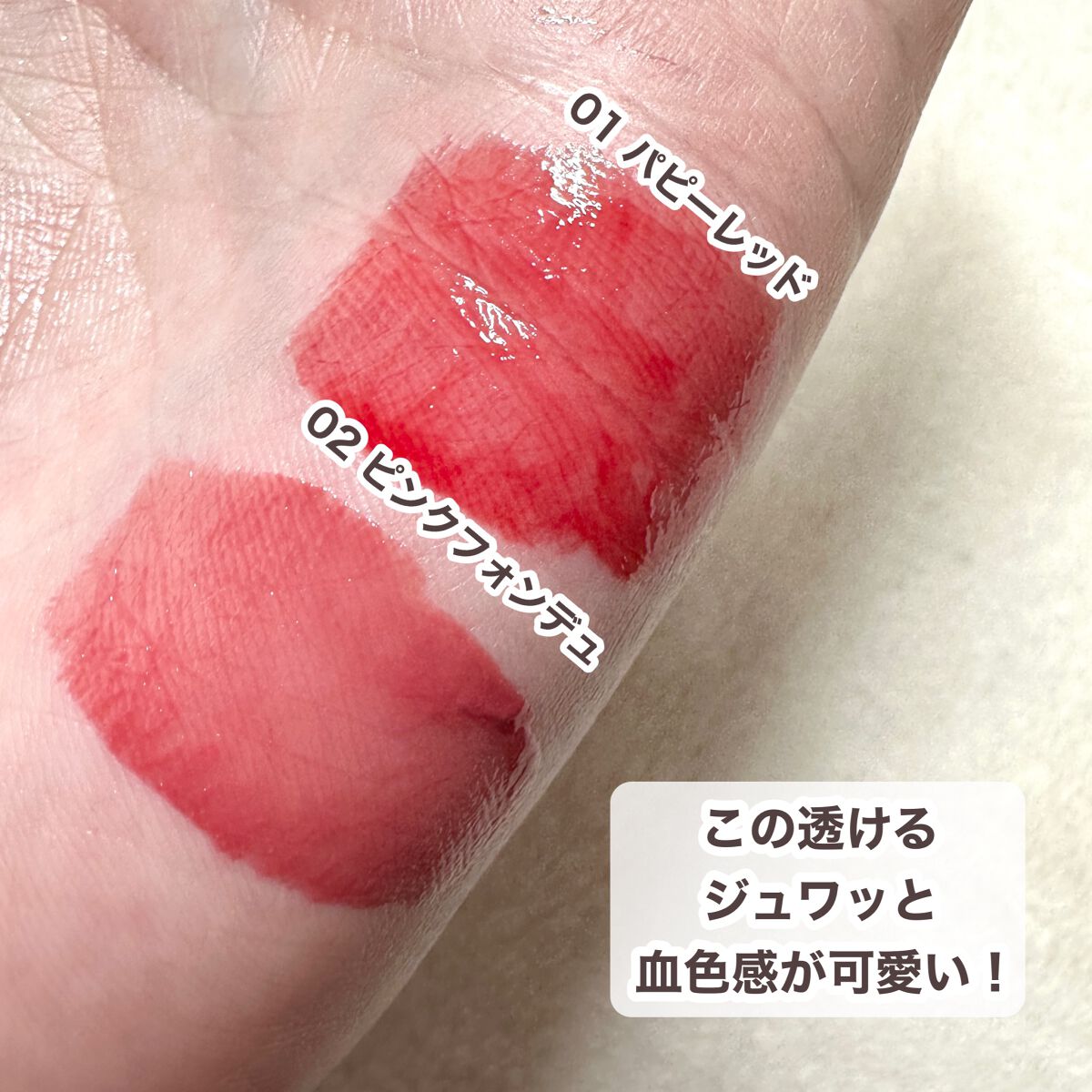 - <01 パピーレッド> 水、ダイマージリノール酸ダイマージリノレイル、ジフェニルジメチコン、ジフェニルシロキシフェニルトリメチコン、オクチルドデカノール、トリイソステアリン酸ポリグリセリルー2、ラウロイルグルタミン酸ジ(フィトステリル/オクチルドデシル)、ダイマージリノール酸(フィトステリル/イソステアリル/セチル/ステアリル/ベヘニル)、BG、水添ポリイソブテン、グリセリン、セテスー10、エタノール、セチルPEG/PPGー10/1ジメチコン、(アクリル酸ヒドロキシエチル/アクリロイルジメチルタウリンNa)コポリマー、イソヘキサデカン、フェノキシエタノール、メチルパラベン、ポリソルベート60、トコフェロール、エチルパラベン、デヒドロ酢酸Na、リン酸2Na、リン酸Na、シメチコン、シリカ、ハチミツ、スクワラン、ステアリン酸ソルビタン、ステアリン酸グリセリル、オレイン酸ポリグリセリルー10、セルロースガム、ヒアルロン酸Na、ローズマリー葉エキス、(+/ー)酸化鉄、酸化チタン、赤227、黄4、赤226、ポリアスパラギン酸Na、PVP、アクリレーツコポリマーアンモニウム、キサンタンガム、水酸化Al、EDTAー2Na <02 ピンクフォンデュ> 水、ダイマージリノール酸ダイマージリノレイル、ジフェニルジメチコン、ジフェニルシロキシフェニルトリメチコン、オクチルドデカノール、トリイソステアリン酸ポリグリセリルー2、ラウロイルグルタミン酸ジ(フィトステリル/オクチルドデシル)、ダイマージリノール酸(フィトステリル/イソステアリル/セチル/ステアリル/ベヘニル)、BG、水添ポリイソブテン、グリセリン、セテスー10、エタノール、セチルPEG/PPGー10/1ジメチコン、(アクリル酸ヒドロキシエチル/アクリロイルジメチルタウリンNa)コポリマー、イソヘキサデカン、フェノキシエタノール、メチルパラベン、ポリソルベート60、トコフェロール、エチルパラベン、デヒドロ酢酸Na、リン酸2Na、リン酸Na、シメチコン、シリカ、ハチミツ、スクワラン、ステアリン酸ソルビタン、ステアリン酸グリセリル、オレイン酸ポリグリセリルー10、セルロースガム、ヒアルロン酸Na、ローズマリー葉エキス、(+/ー)酸化鉄、酸化チタン、赤227、黄4、赤226、ポリアスパラギン酸Na、PVP、アクリレーツコポリマーアンモニウム、キサンタンガム、水酸化Al、EDTAー2Na <03 リッチグァバティー> 水、ダイマージリノール酸ダイマージリノレイル、ジフェニルジメチコン、グリセリン、ジフェニルシロキシフェニルトリメチコン、オクチルドデカノール、BG、トリイソステアリン酸ポリグリセリル-2、ダイマージリノール酸(フィトステリル/イソステアリル/セチル/ステアリル/ベヘニル)、セチルPEG/PPG-10/1ジメチコン、セテス-10、水添ポリイソブテン、ステアリン酸グリセリル(SE)、フェノキシエタノール、カルボマー、水酸化K、ステアロイルグルタミン酸Na、メチルパラベン、(アクリレーツ/アクリル酸アルキル(C10-30))クロスポリマー、トコフェロール、ポリソルベート80、ハチミツ、ヒアルロン酸Na、ローズマリー葉エキス、酸化チタン、酸化鉄、赤227、黄4、黄5、シリカ、水酸化Al、赤104(1)、青1 <04 オレンジアールグレイ> 水、ダイマージリノール酸ダイマージリノレイル、ジフェニルジメチコン、グリセリン、ジフェニルシロキシフェニルトリメチコン、オクチルドデカノール、BG、トリイソステアリン酸ポリグリセリル-2、ダイマージリノール酸(フィトステリル/イソステアリル/セチル/ステアリル/ベヘニル)、セチルPEG/PPG-10/1ジメチコン、セテス-10、水添ポリイソブテン、ステアリン酸グリセリル(SE)、フェノキシエタノール、カルボマー、水酸化K、ステアロイルグルタミン酸Na、メチルパラベン、(アクリレーツ/アクリル酸アルキル(C10-30))クロスポリマー、トコフェロール、ハチミツ、ヒアルロン酸Na、ローズマリー葉エキス、酸化鉄、黄4、赤227、黄5、シリカ <05 コンポートピンク> 水、ジフェニルジメチコン、ダイマージリノール酸ダイマージリノレイル、グリセリン、ジフェニルシロキシフェニルトリメチコン、オクチルドデカノール、BG、トリイソステアリン酸ポリグリセリル-2、ダイマージリノール酸(フィトステリル/イソステアリル/セチル/ステアリル/ベヘニル)、水添ポリイソブテン、セテス-10、セチルPEG/PPG-10/1ジメチコン、ステアリン酸グリセリル(SE)、フェノキシエタノール、カルボマー、水酸化K、ステアロイルグルタミン酸Na、(アクリレーツ/アクリル酸アルキル(C10-30))クロスポリマー、メチルパラベン、トコフェロール、ポリソルベート80、ハチミツ、ヒアルロン酸Na、ローズマリー葉エキス、(+/-)酸化チタン、酸化鉄、赤227、赤104(1)、黄4、黄5、シリカ、水酸化Al、青1 <06 ピンクマーガレット> 水、ジフェニルジメチコン、ダイマージリノール酸ダイマージリノレイル、グリセリン、ジフェニルシロキシフェニルトリメチコン、オクチルドデカノール、BG、トリイソステアリン酸ポリグリセリル-2、ダイマージリノール酸(フィトステリル/イソス